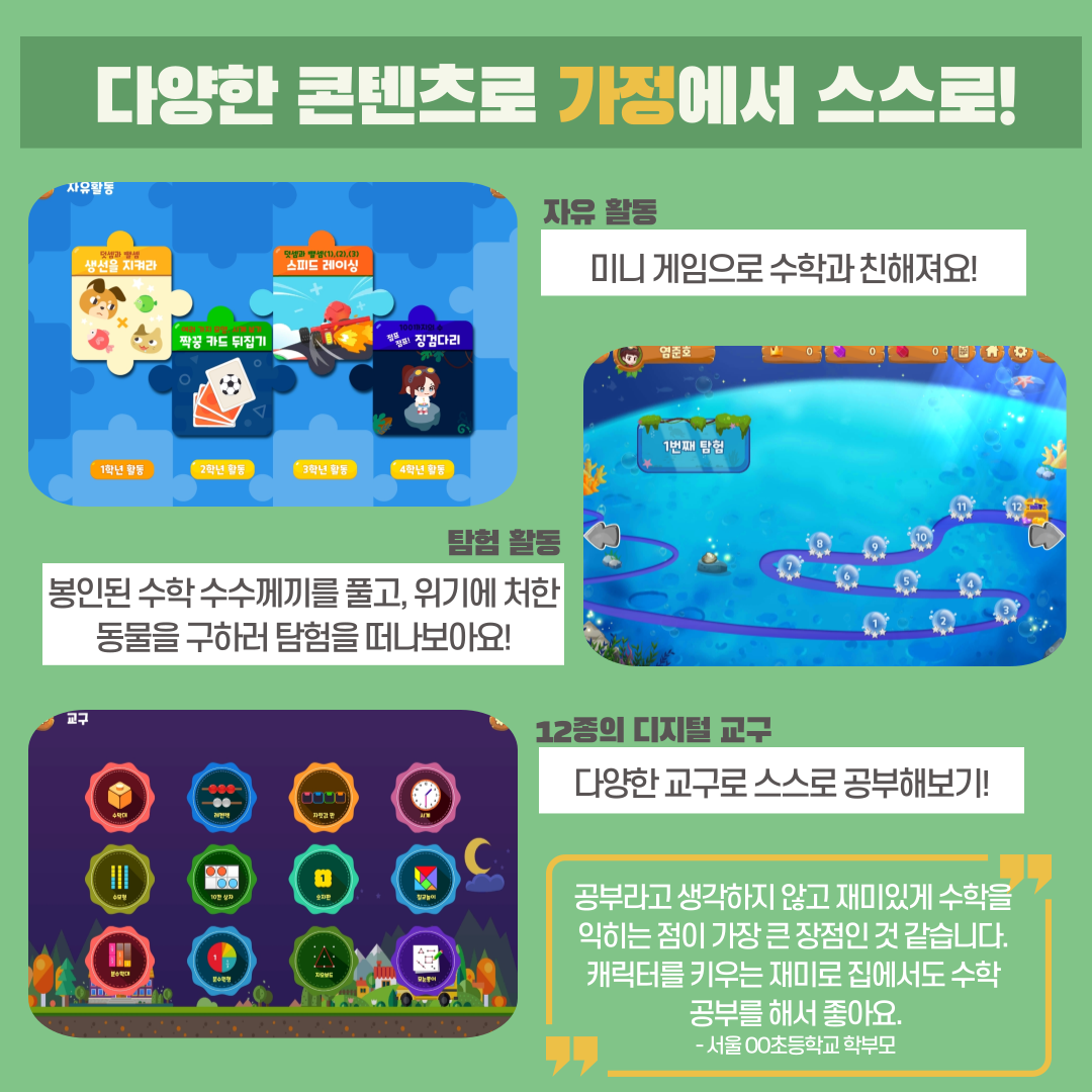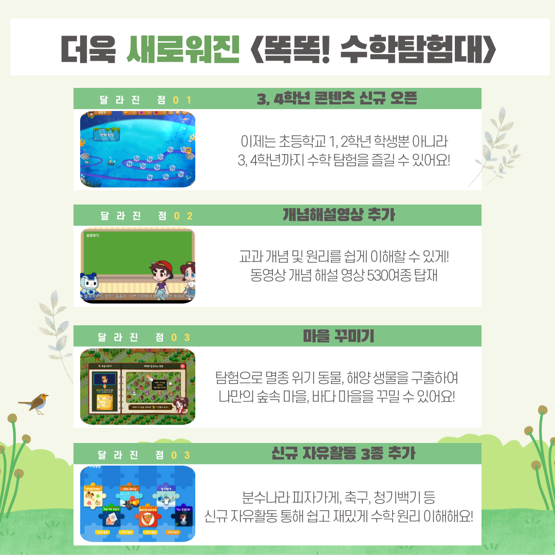 이렇게 학습에 도움을 주는 <똑똑! 수학탐험대>는 매년 학생들을 위해 기능을 추가하고 있습니다. 올해는 초등학교 3, 4학년 콘텐츠가 신규로 나왔습니다. 초등학교 1, 2학년 학생뿐만 아니라 4학년까지 즐거운 수학 탐험을 떠날 수 있게 되었습니다.