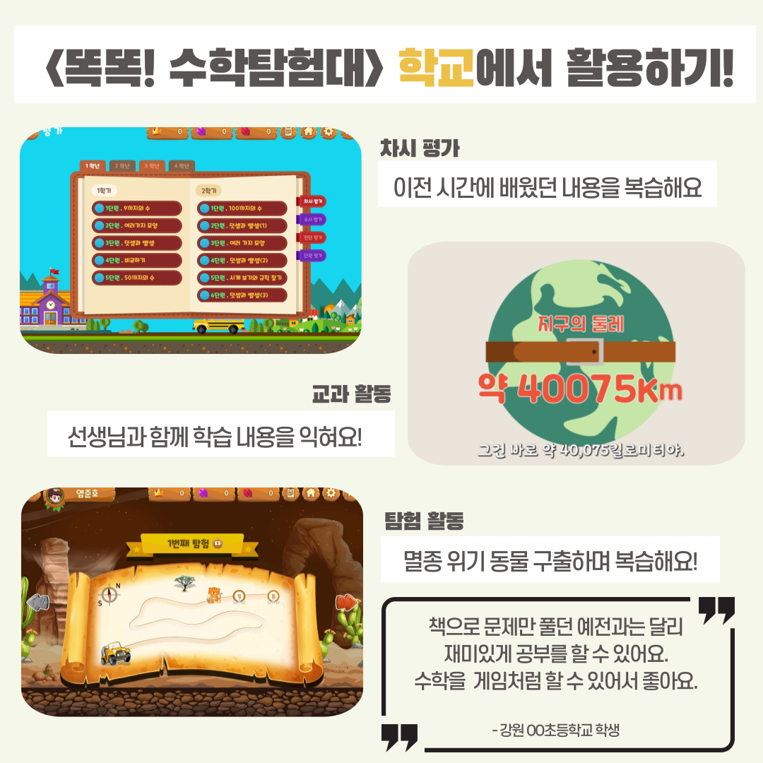 학교에서 선생님과 함께한다면 <똑똑! 수학탐험대>를 더 다채롭게 활용할 수 있습니다. '차시 평가'를 통해 이전에 공부했던 내용을 복습하고, '교과 활동'을 통해 선생님과 함께 학습 내용을 익힐 수 있습니다.