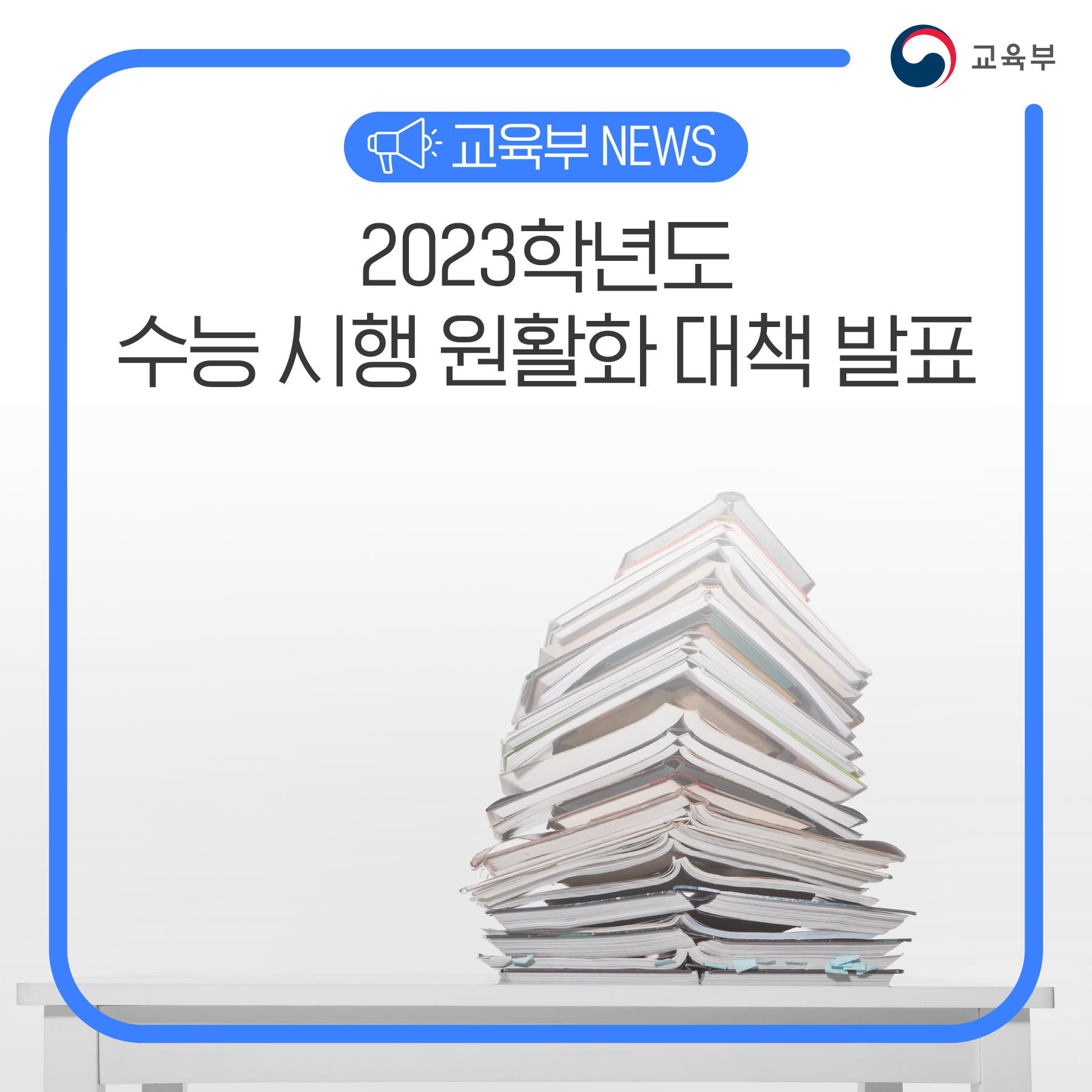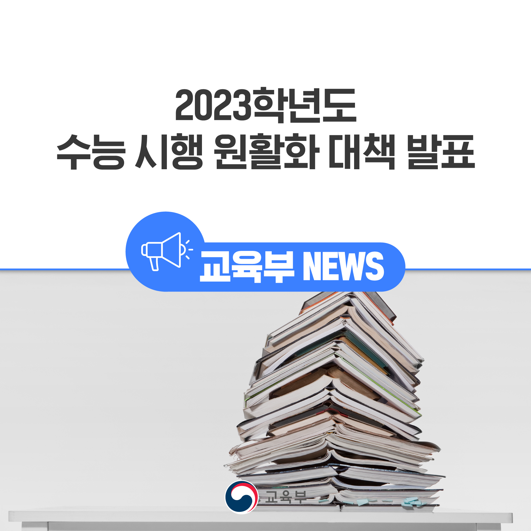 교육부는 대학수학능력시험(이하 ‘수능’)을 안정적으로 시행하기 위한 「2023학년도 수능 시행 원활화 대책」을 10월 18일(화) 국무회의에서 보고·발표하였다.