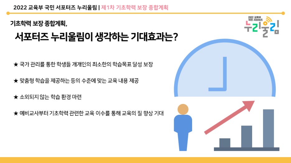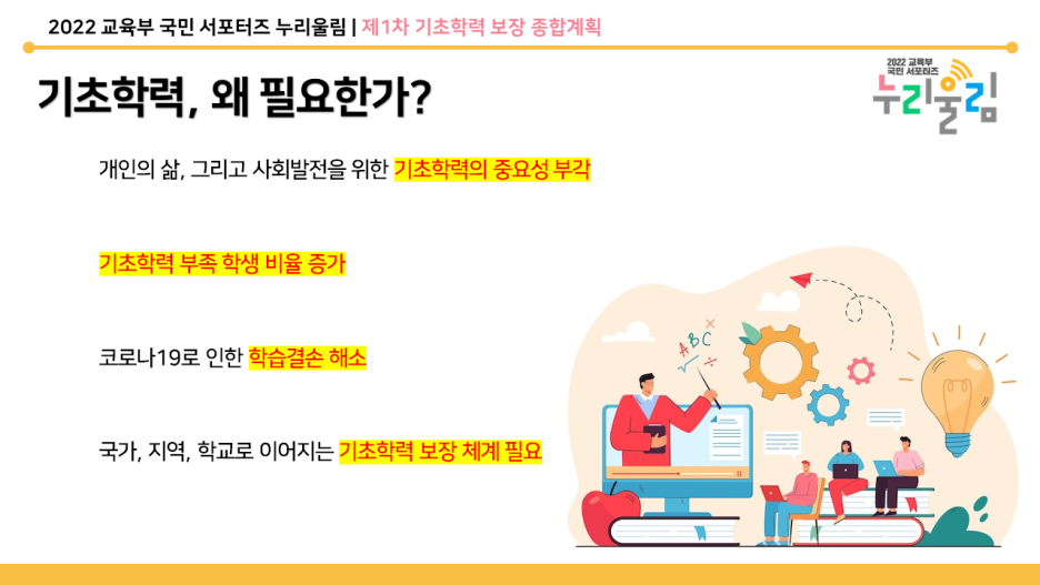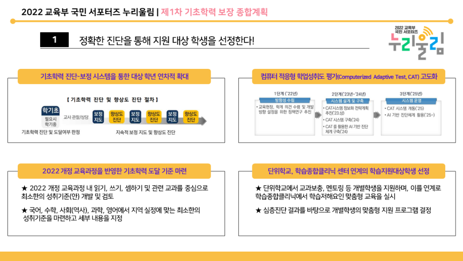학생들이 잠재적인 역량을 발현할 수 있도록 균등한 교육 기회를 제공받는 것은 무엇보다도 중요합니다. 코로나19로 학습 결손이 발생한 지금. 기초학력 보장의 중요성이 강조되고 있습니다. 이러한 배경을 바탕으로 ‘제1차 기초학력 보장 종합계획(2023~2027)’이 발표됐습니다.