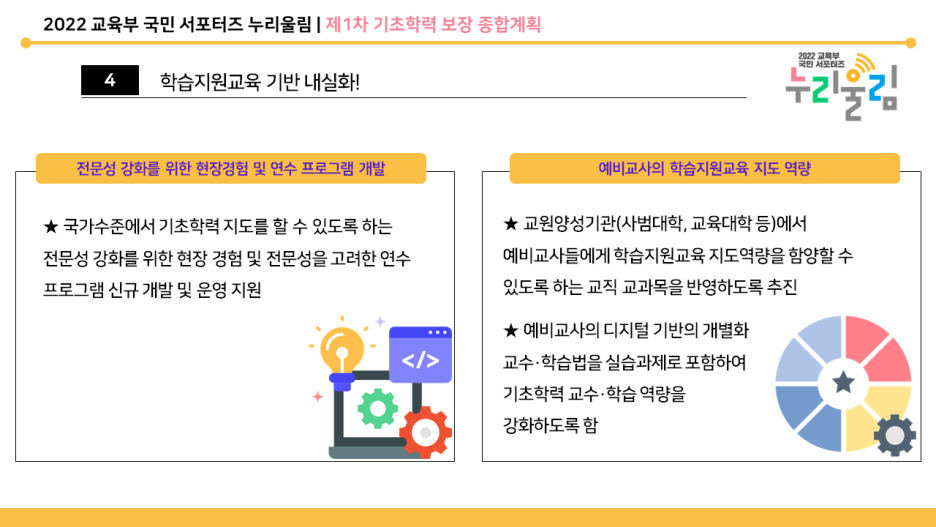 넷째, 교원 지원 및 교원양성과정 개선 등 학습지원 교육의 기반을 내실화합니다. 교원 전문성을 강화하기 위한 연수 프로그램 운영, 기초학력 담당 교원의 여건 정비, 예비교원의 기초학력 지도역량을 키우고 경험할 수 있도록 지원할 예정입니다.