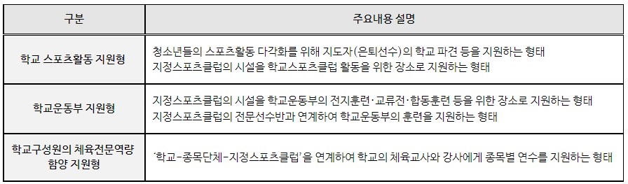 * 기초 비인기 종목 육성형, 체육 취약계층 지원형, 지역 특화형, 학교 연계형, 전문선수반 운영형
