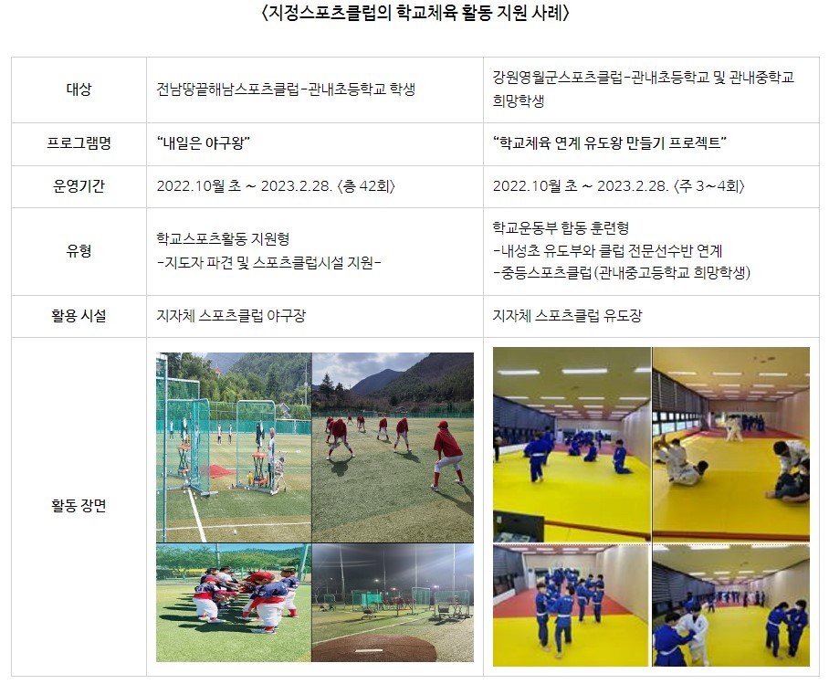 이를 통해 단위학교 체육활동과 스포츠종목 운영이 더욱 다양화되고, 학교스포츠클럽 운영도 내실화될 것으로 기대한다.