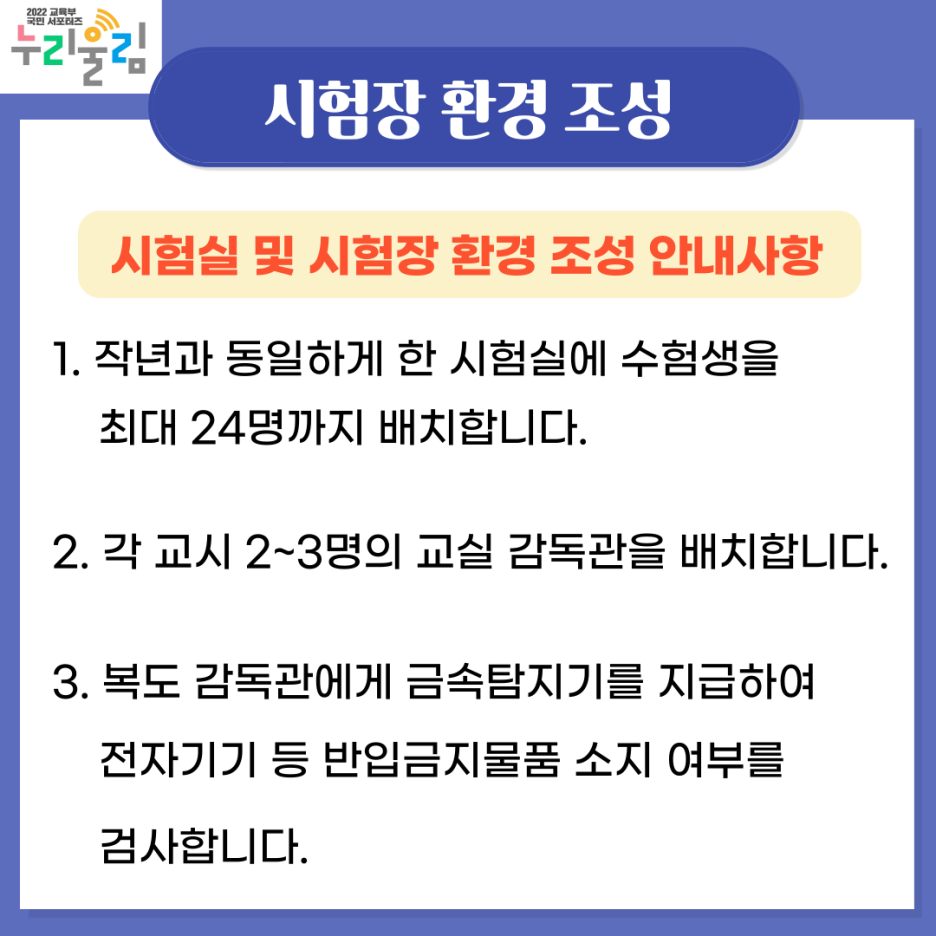 먼저 이번 2023학년도 대학수학능력시험 시험장 환경 안내입니다. 작년과 동일하게 한 시험실마다 수험생을 최대 24명까지 배치하고, 불필요한 기자재를 별도 장소로 이동하여 수험생 간 간격을 확보할 예정입니다. 각 교시 2~3명의 교실 감독관을 배치하고, 복도 감독관에게 금속탐지기를 지급하여 전자기기 등 반입금지 물품 소지 여부를 검사할 예정입니다. 또한, 혹시 모를 시험 방해 및 부정행위 요소를 예방하기 위해 각 시험장의 시험실마다 사물함과 책상 서랍 등을 사전 점검하고, 경찰청의 협조를 받아 수능 당일 시험장 주변에 대한 순찰을 강화하여 외부와 연계한 조직적 부정행위 발생을 예방할 계획입니다.