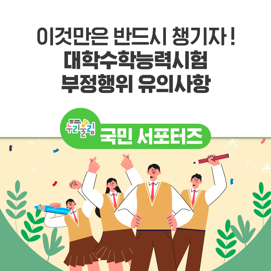 교육부는 10월 5주부터 각 시도교육청, 한국교육과정평가원과 함께 부정행위 관련 규정 등 수험생이 유의하여야 하는 사항을 담은 영상물과 책자를 제작 및 배포하고, 수험생을 대상으로 학교 등에서 안내‧교육할 수 있도록 지원합니다.
