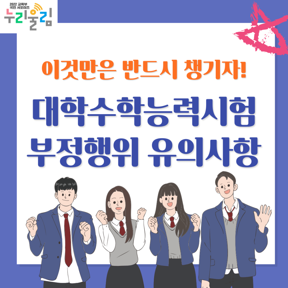 한 해 코끝이 쌀쌀해지기 시작한 요즘, 어느덧 2023학년도 대학수학능력시험이 얼마 남지 않았습니다. 오늘은 2023학년도 수능 부정행위 관련 규정과 수능 응시 전 꼭 확인해야 하는 사항들에 대해 안내해 드리겠습니다.