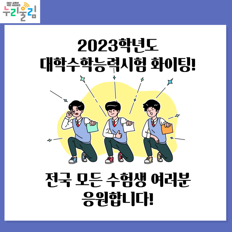 2023년도 대학수학능력시험을 위해 지금까지 열심히 달려오신 수험생 여러분! 수고 많으셨습니다. 남은 기간에도 잘 마무리해서 모두 원하는 결과 얻을 수 있기를 함께 응원하겠습니다.