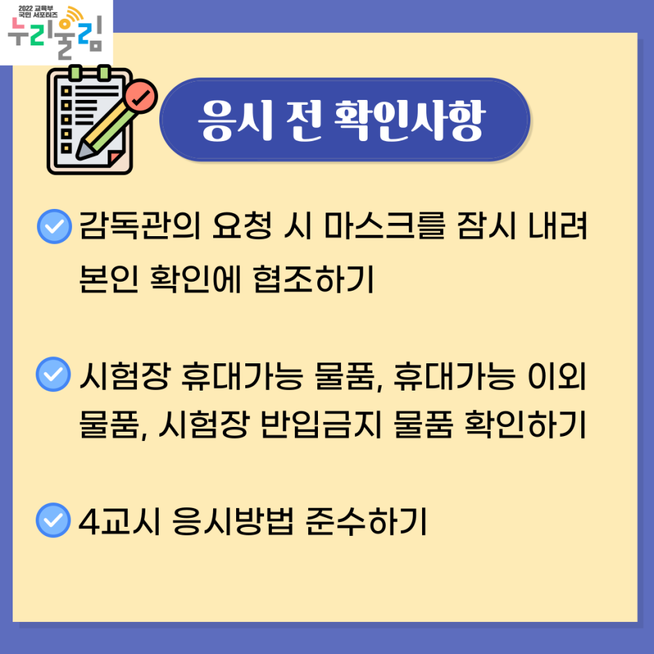 2023학년도 대학수학능력시험을 응시하기 전, 부정행위 방지를 위한 확인사항을 아래와 같이 다시 한 번 정리해 보았습니다.