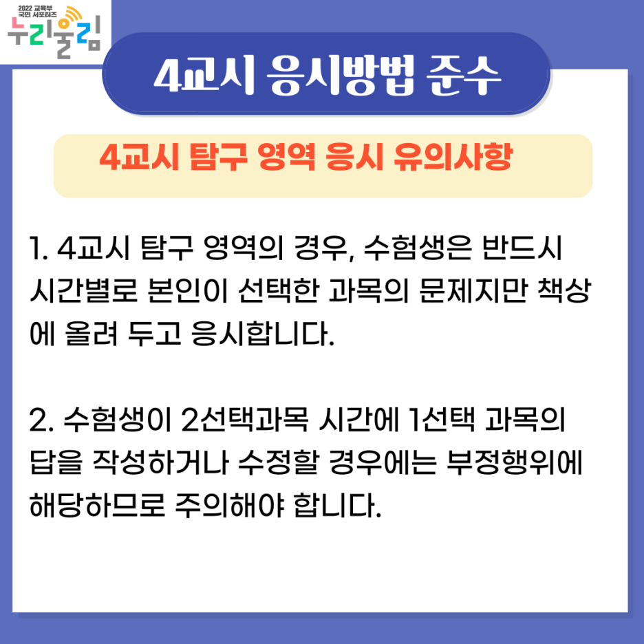 마지막으로 4교시 탐구 영역의 응시방법에 대해 알려드리겠습니다. 수험생은 반드시 시간별로 본인이 선택한 과목의 문제지만 책상에 올려 두고 응시해야 합니다. 이를 따르지 않고, 본인의 선택과목 순서를 바꾸어서 책상 위에 올려두거나 푸는 경우, 선택과목의 문제지를 동시에 책상 위에 올려두거나 푸는 경우 모두 부정행위로 간주하여 시험이 무효 처리되므로 특히 유의하셔야 합니다.