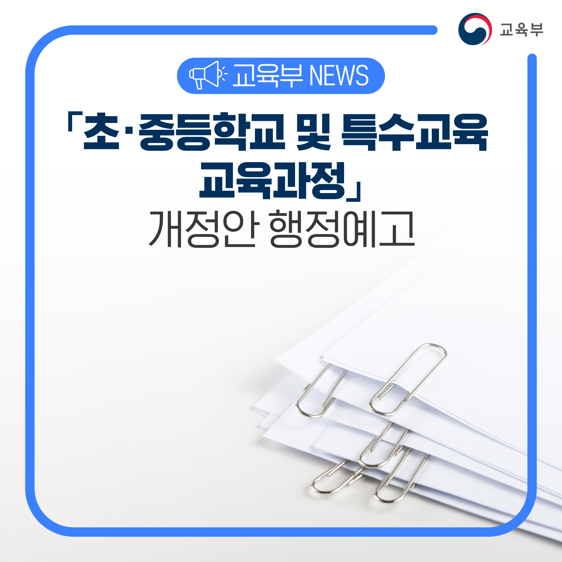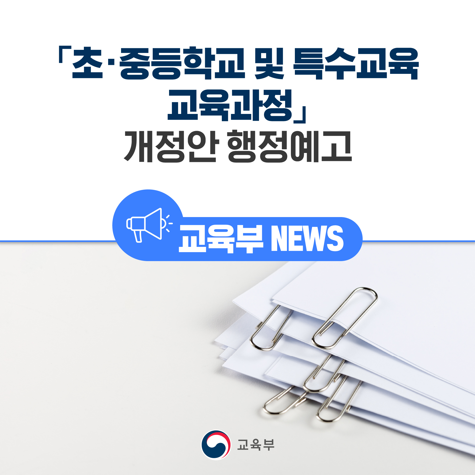 교육부(부총리 겸 교육부장관 이주호)는 11월 9일(수)부터「초‧중등학교 교육과정」과「특수교육 교육과정」개정안에 대한 행정예고를 실시한다.