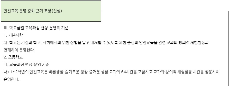 ① (총론) 학교에서 학생들의 발달 수준에 맞게 체험 중심의 안전교육을 관련 교과와 창의적 체험활동과 연계하여 강화할 수 있도록 근거 조항을 마련하였다.