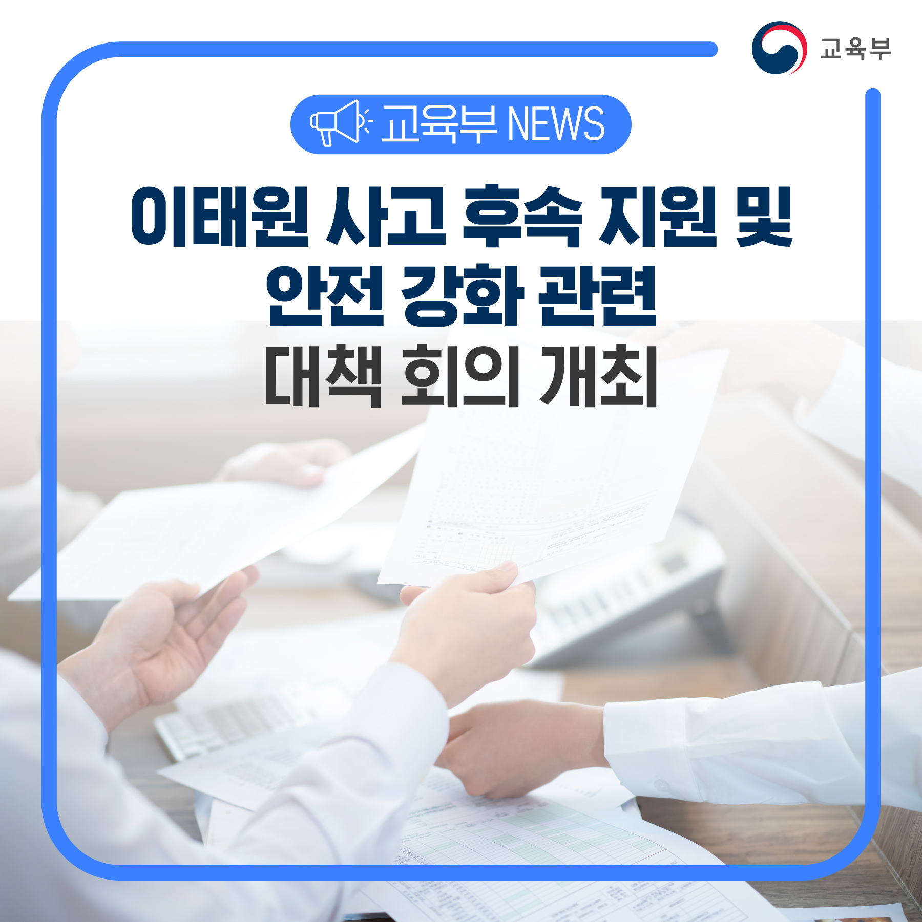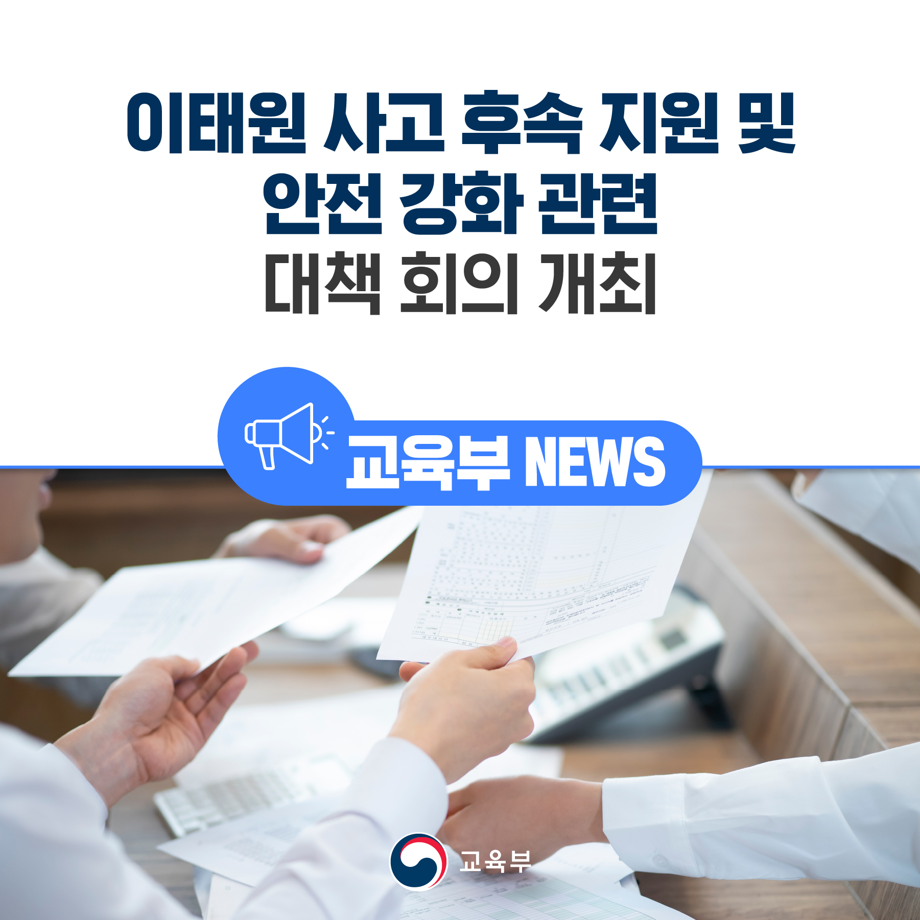 교육부(사회부총리 겸 교육부장관 이주호)는 이태원 사고 관련 대학생 지원 방안과 대학 안전강화 대책을 주제로 11월 9일(수), 세종청사에서 (전문)대학교육협의회장, 대학 총장 등 관계자와 대책회의를 개최한다.