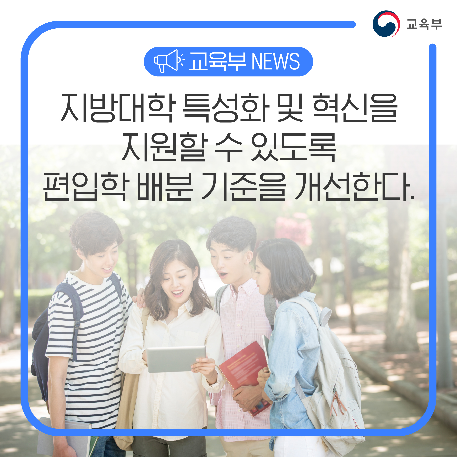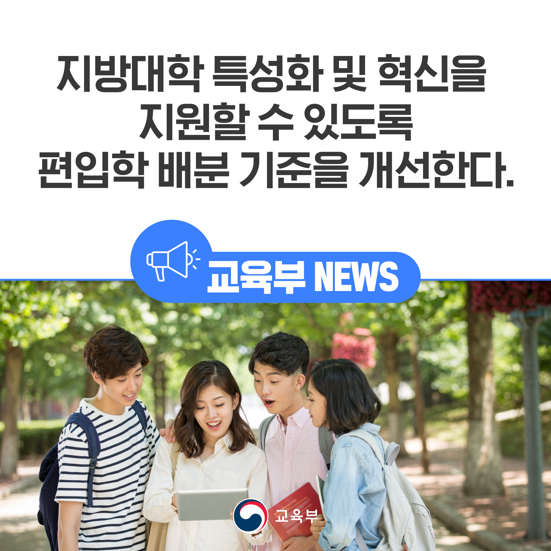 교육부(부총리 겸 교육부장관 이주호)는 지방대학의 급속한 사회 변화에의 대응과 수요맞춤형 인재의 단기간(2~3년) 양성을 지원하기 위하여 강점이 있는 학과에 편입학을 더 뽑을 수 있도록 편입학 배분 기준을 개선한다.