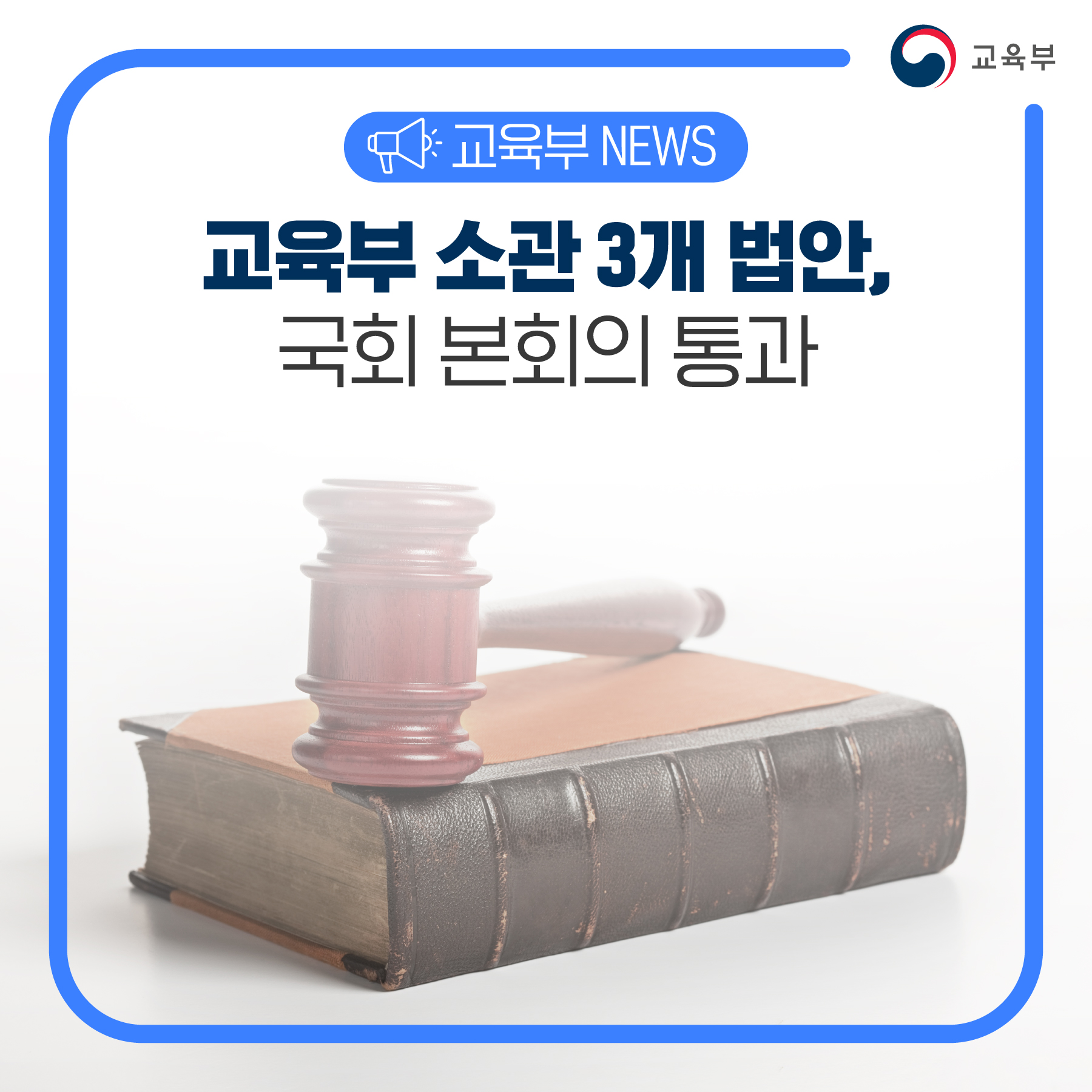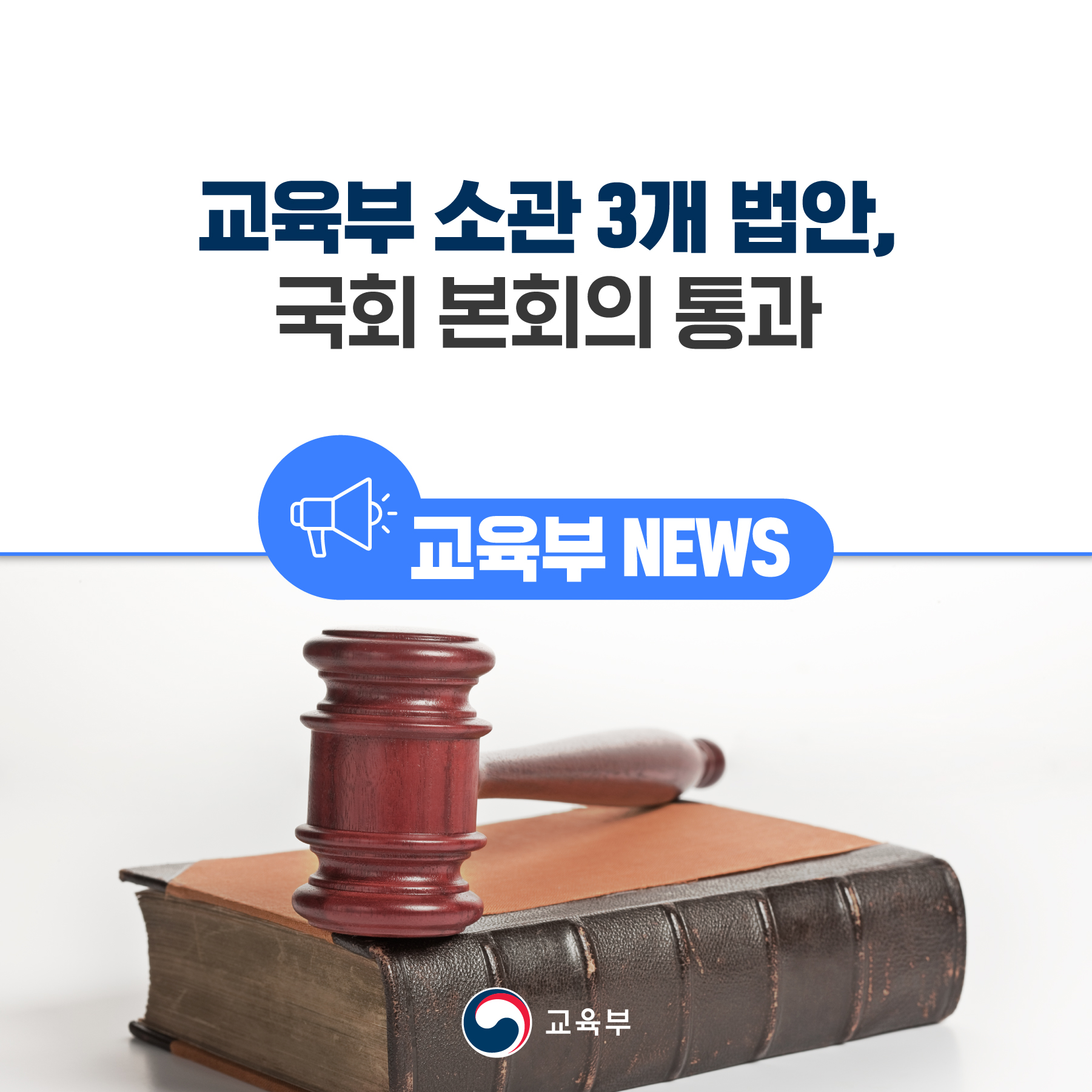 교육부(부총리 겸 교육부장관 이주호)는 11월 24일(목), 국회 본회의에서 「사립학교법」, 「교육공무원법」, 「산업교육진흥 및 산학연협력촉진에 관한 법률」 등 3개 법안이 의결되었다고 발표하였다.
