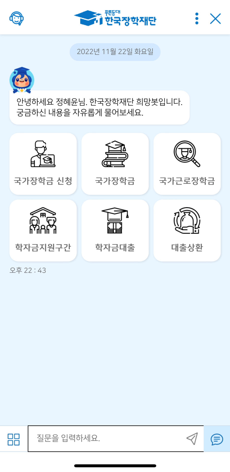 마지막으로 국가장학금 신청 시 소소한 꿀팁이 있다면?! 바로 한국장학재단 모바일 앱입니다. 저는 언제 어디서나 편리하게 이용할 수 있는 한국장학재단 모바일 앱을 주로 이용하고 있는데요. 앱을 활용해 오른쪽 하단에 위치한 한국장학재단 희망봇을 클릭하면 궁금한 내용을 손쉽게, 한눈에 찾아볼 수 있습니다.