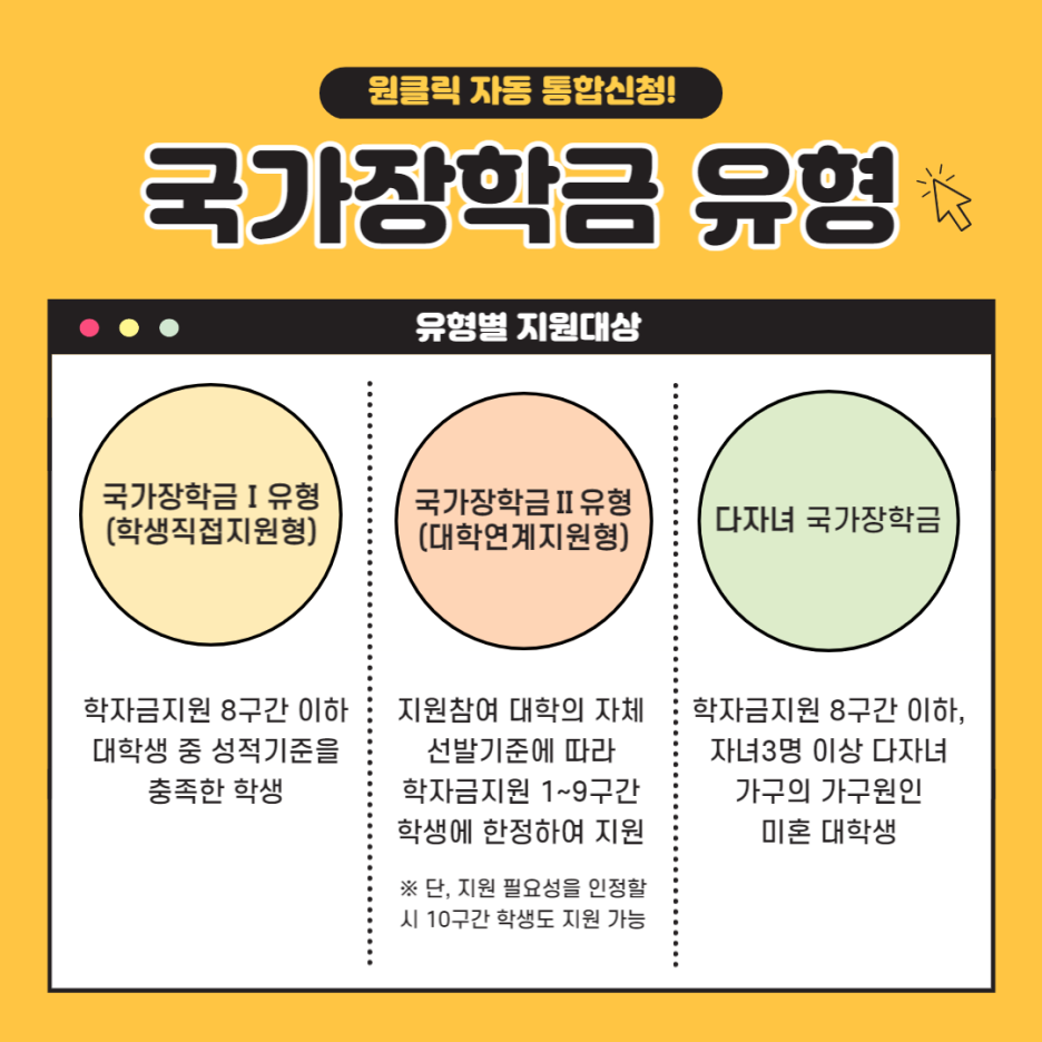 *3가지 유형에는 국가장학금Ⅰ·Ⅱ 유형과 다자녀 국가장학금이 있습니다.