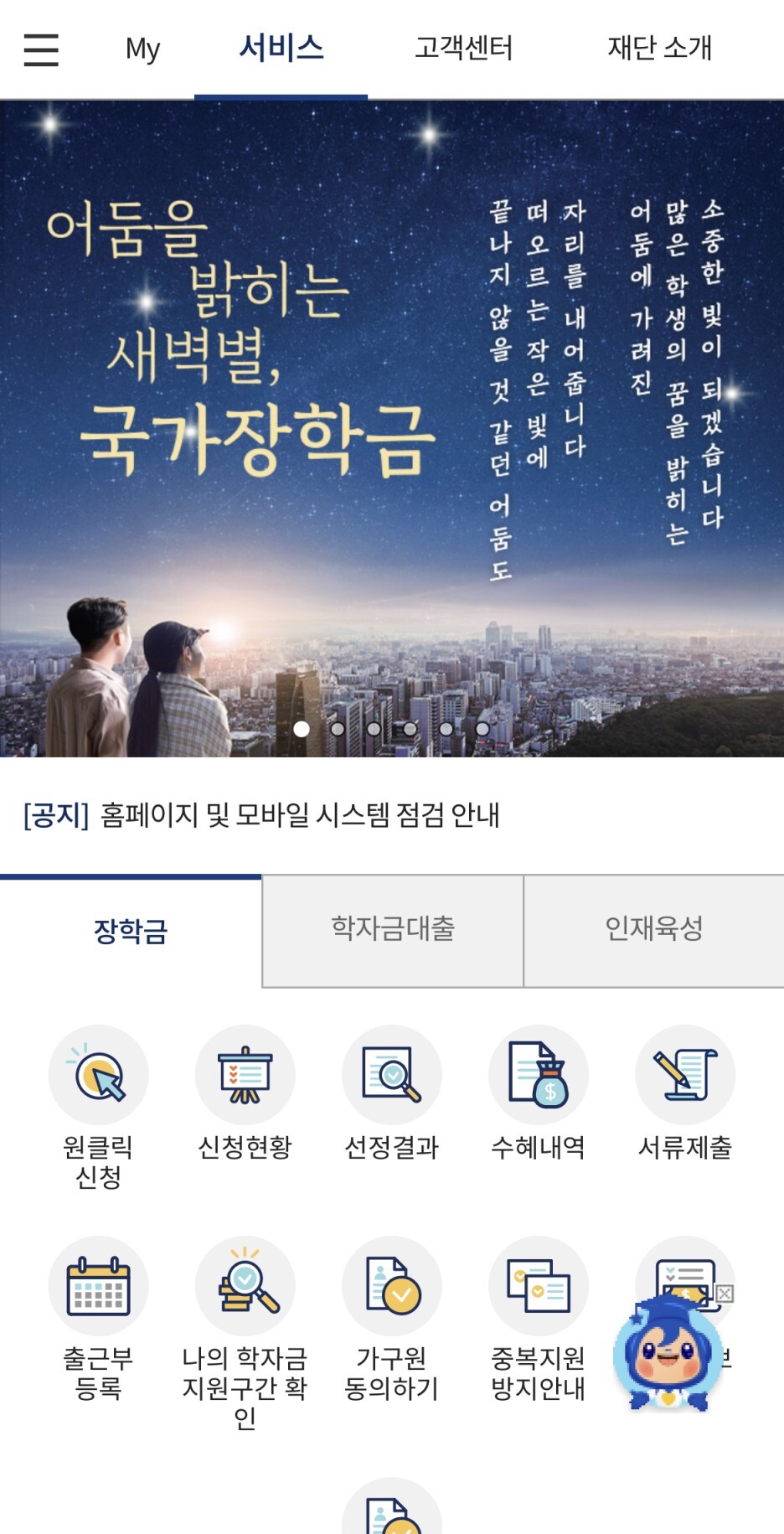 모바일 앱에 들어가면 가장 먼저 보이는 <어둠을 밝히는 새벽 별, 국가장학금>이라는 문구가 제겐 잔잔한 울림으로 다가왔는데요. 국가장학금이 꿈꾸는 대학생들에게 새벽 별과 같다면, 꿈꾸는 대학생은 국가에 새벽 별과 같다고 생각합니다. 꿈을 꾸는 대학생 여러분 2023학년도 1학기 국가장학금, 지금 꼭 신청하세요!