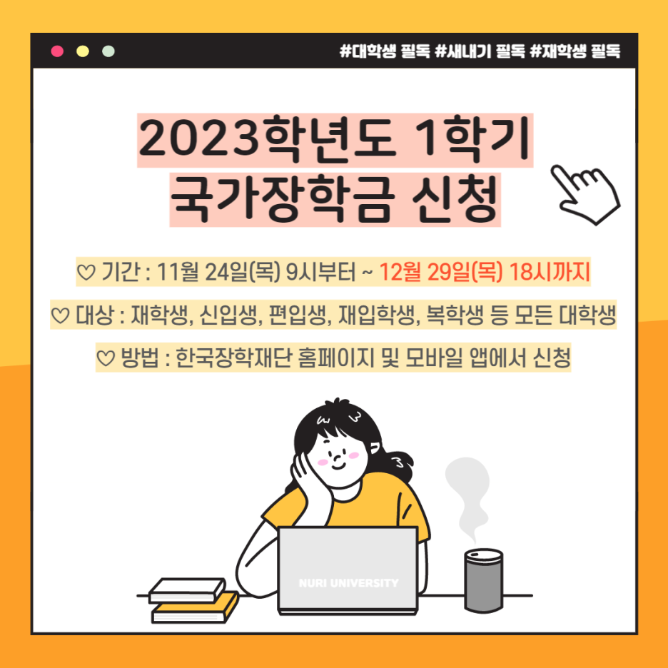 한 해를 마무리하는 시점에 놓치지 말아야 할 중요한 일정이 있는데요. 바로, 2023학년도 1학기(1차) 국가장학금 신청입니다. 오늘 누리울림과 함께 국가장학금 신청 정보 알아볼까요?