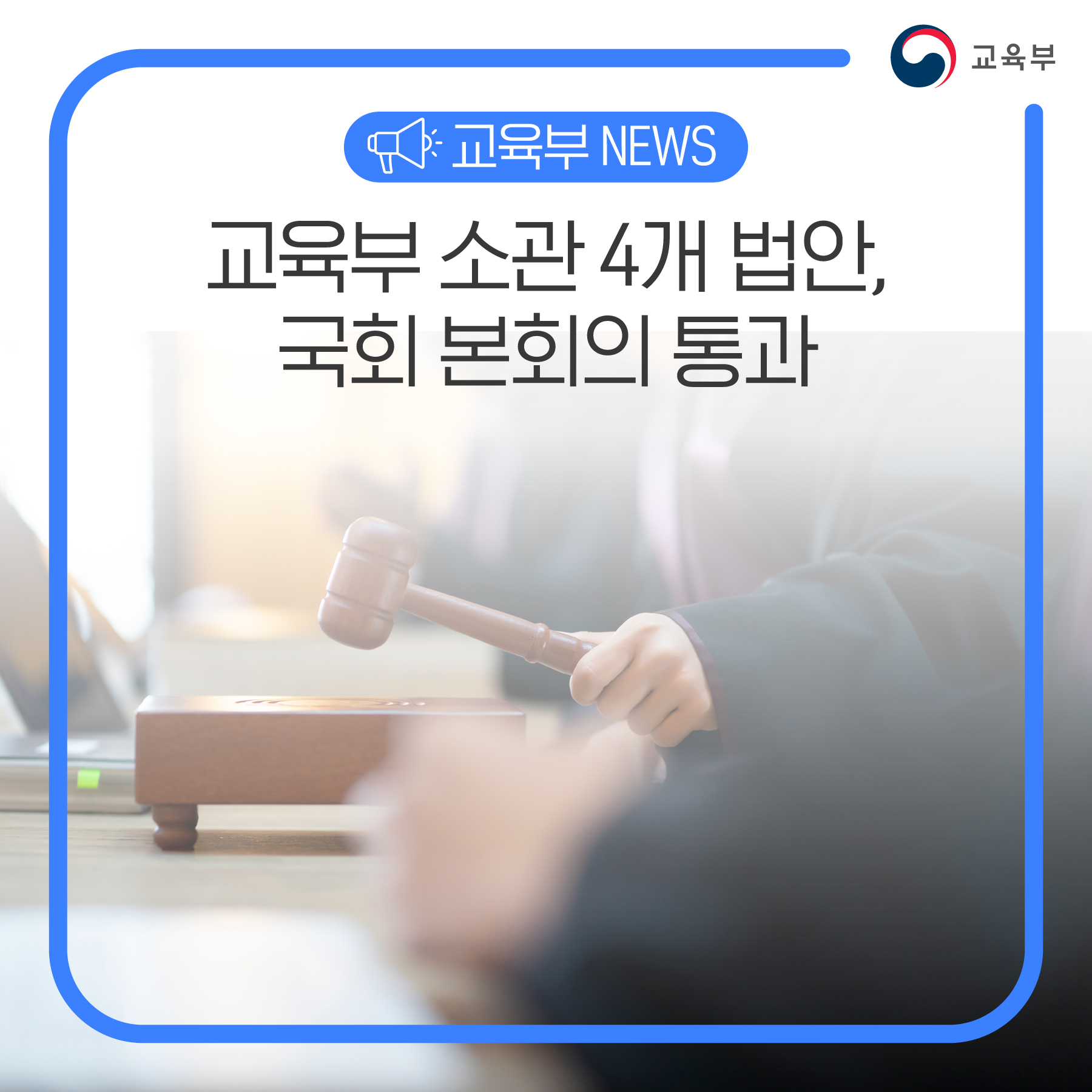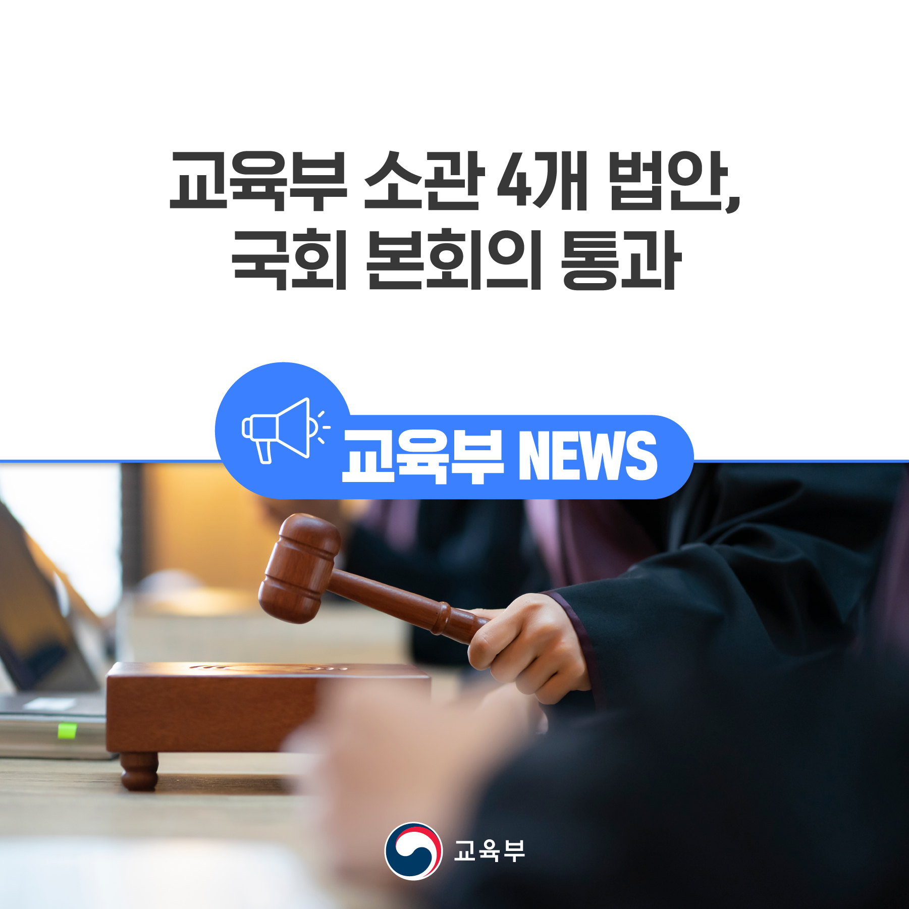 교육부(부총리 겸 교육부장관 이주호)는 12월 8일(목) 국회 본회의에서 「초·중등교육법」, 「취업 후 학자금 상환 특별법」 등 교육부 소관 4개 법안이 의결되었다고 발표하였다.