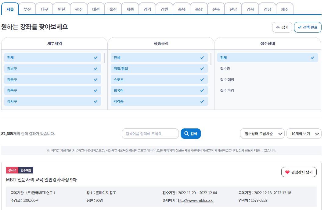 [오프라인 교육정보] - [우리 동네 강좌]를 통해 전국 17개 시·도가 제공하는 오프라인 강좌를 찾아볼 수 있습니다. 특정 지역의 세부 지역을 선택하고 강좌의 주제, 접수 상태까지 세부적으로 검색할 수 있습니다. 요즘 유행하는 MBTI부터 가족 상담치료, 게임 콘셉트 디자인까지! 재밌고 특이한 주제가 많아서 다양하게 선택할 수 있을 것 같습니다.