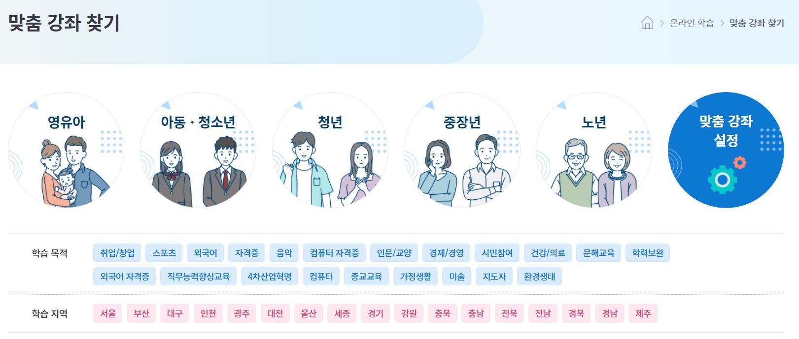 [온라인 학습] - [맞춤 강좌 찾기]를 활용하는 방법도 있는데요. 영유아부터 노년층까지 나이대를 설정하고 관심 분야와 지역까지 설정해 검색하면, 오프라인, 온라인 강좌를 한눈에 볼 수 있습니다.