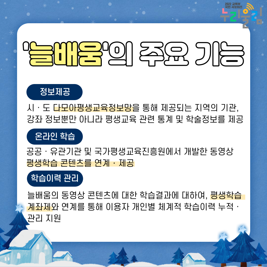 국가평생학습포털 ‘늘배움’은 전국에 산재되어 있는 평생교육정보, 학습 콘텐츠 등을 한 곳에서 제공해 모든 국민들이 언제, 어디서나 원하는 평생학습 기회를 누릴 수 있도록 지원하는 평생학습 종합포털입니다.