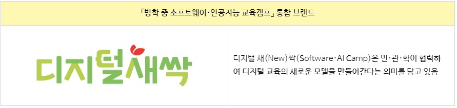 디지털 새싹 캠프는 「디지털 인재양성 종합방안」(8.22. 발표)의 후속 조치로서, 전국의 초·중·고 학생들에게 소프트웨어와 인공지능에 대한 관심과 흥미를 유발하고, 체험과 교육기회를 제공하기 위해 전국단위로 처음 실시되는 방학 중 교육 사업이다.