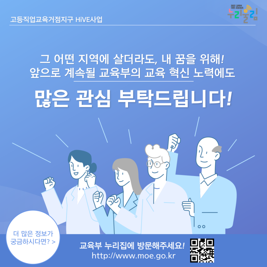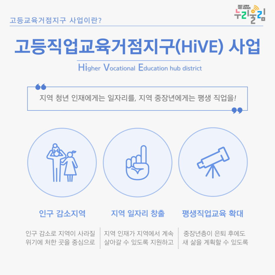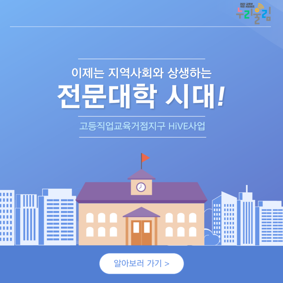 고등직업교육거점지구(HiVE)가 더욱 활성화되도록 교육부의 교육 혁신 노력이 계속될 거라고 하니, 많은 관심 부탁드립니다. 지금까지 누리울림이었습니다. 감사합니다!