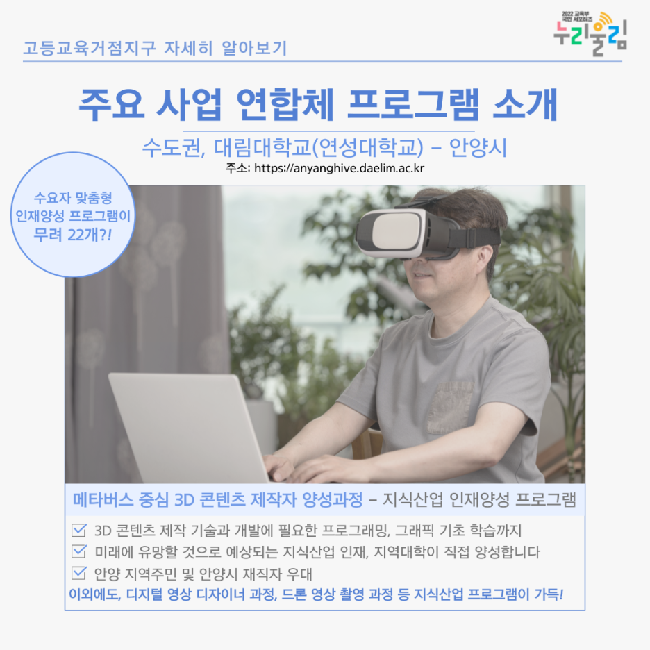세 번째 사례는 수도권의 대림대학교(연성대학교)-안양시 연합체에서 운영하는 ‘메타버스 중심 3D 콘텐츠 제작자 양성과정’입니다. 메타버스와 3D 콘텐츠 제작 분야는 앞으로 유망한 직업 분야에 항상 손꼽히곤 합니다. 저 또한 메타버스(가상현실)와 3D 콘텐츠를 직접 만들어보고 싶은 꿈이 있는데, 저와 같은 꿈이 있는 분들이라면 좋은 경험이 될 것입니다.
