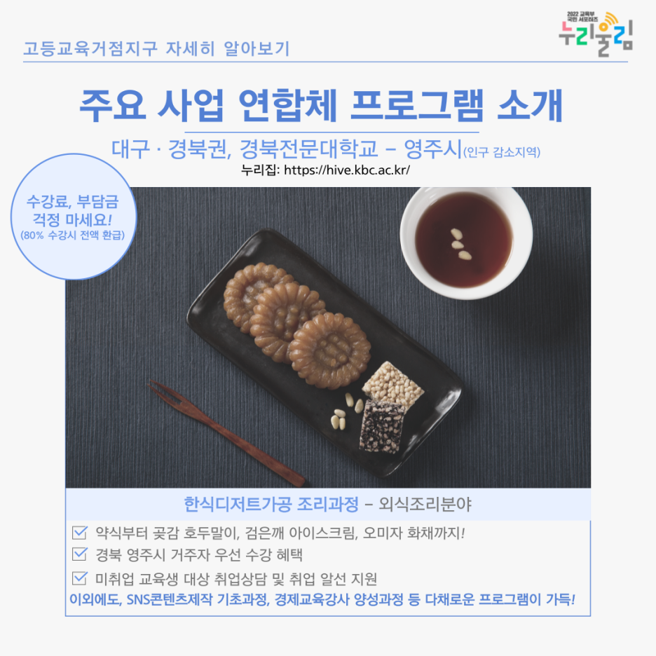 먼저, 대구·경북권의 경북전문대학교-영주시 연합체입니다. 이 연합체에서는 ‘한식디저트가공 조리과정’을 운영하고 있습니다. 우리에게 익숙한 디저트부터 생소한 디저트까지 직접 만들어보고, 만드는 방법까지 배울 수 있다고 합니다. 가장 놀라운 사실은 수강료, 부담금이 없다는 사실! 이외에도, SNS콘텐츠제작 기초과정, 경제교육강사 양성과정 등 다채로운 프로그램도 가득하다고 합니다.