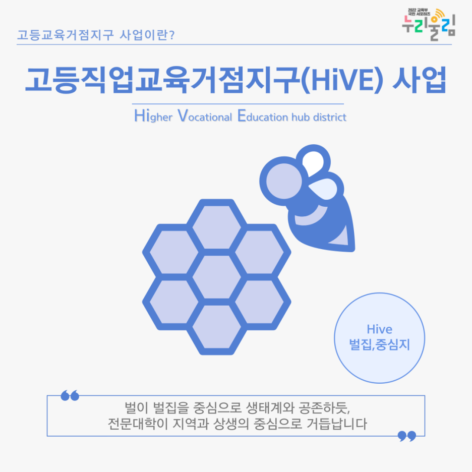 우선, 오늘의 주제인 ‘고등직업교육거점지구(HiVE) 사업’에 대해 설명해 드리겠습니다. HiVE는 벌집, 중심지를 의미합니다. 벌은 벌집을 중심으로 주변 생태계와 상생하지요. 벌이 꽃 사이를 오가며 식물의 수분을 돕는다는 사실도 잘 알고 계실 겁니다. 즉, HiVE는 지역 전문대학이 벌집의 역할을 하며 지역사회와 상생하는 거점이 된다는 의미입니다.