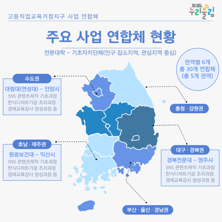 연합체는 지역(기초자치단체)와 중심 전문대학의 연합으로 이루어져 있습니다. 전국을 우선 크게 5개의 권역으로 나누었으며, 한 권역에는 6개의 연합체가 있습니다. 예를 들면, 수도권의 경우 대림대학교(연성대학교)와 안양시, 호남·제주권에는 원광보건대학교와 익산시. 대구·경북권에는 경북전문대학교와 영주시가 힘을 합쳤습니다.