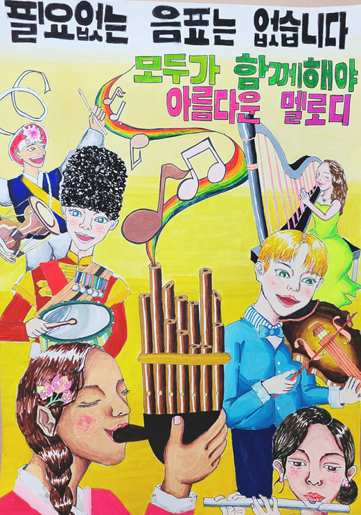 세계 여러 나라 학생들이 다양한 악기를 연주하며 아름다운 하모니를 이루는 그림을 통해 공존과 화합의 메시지를 표현