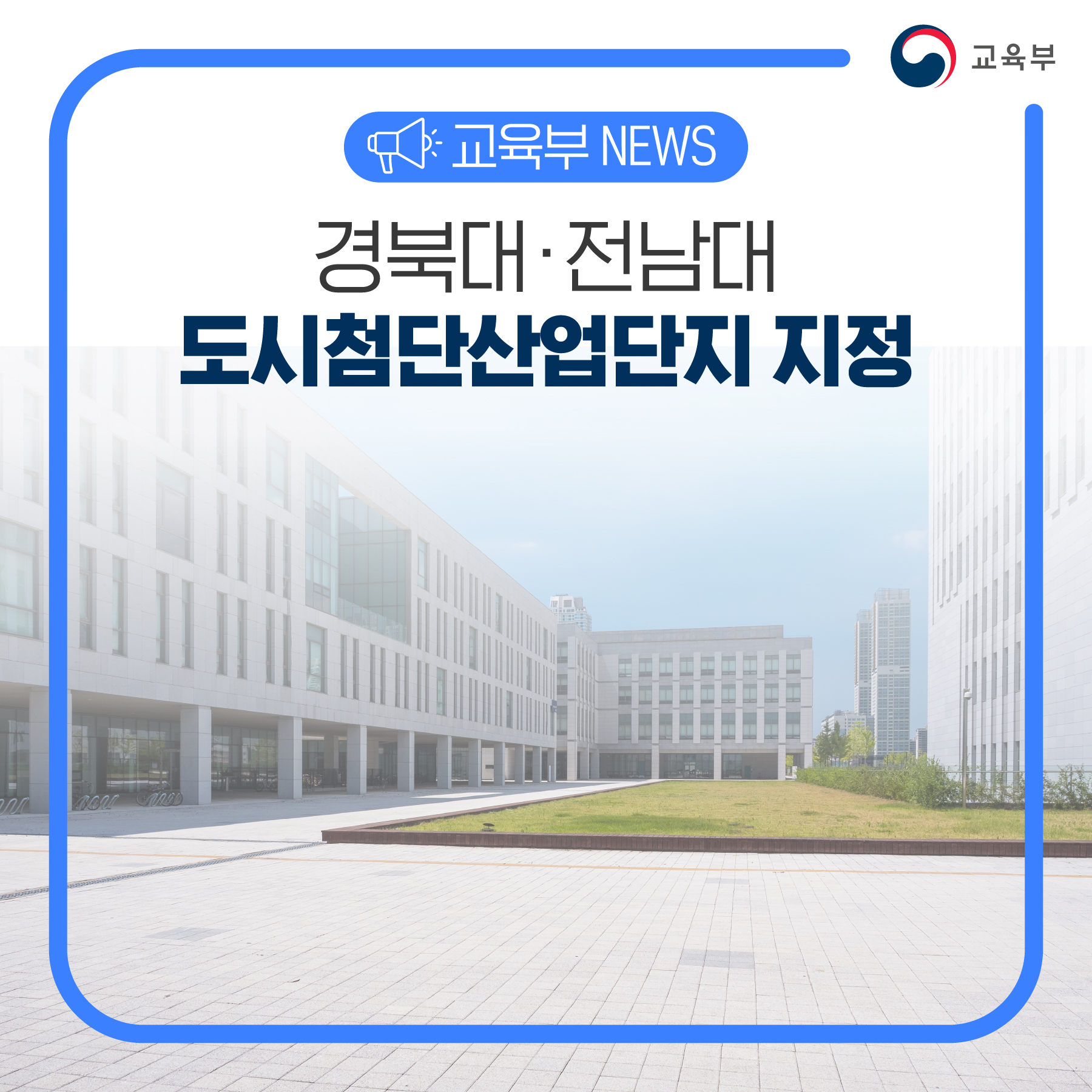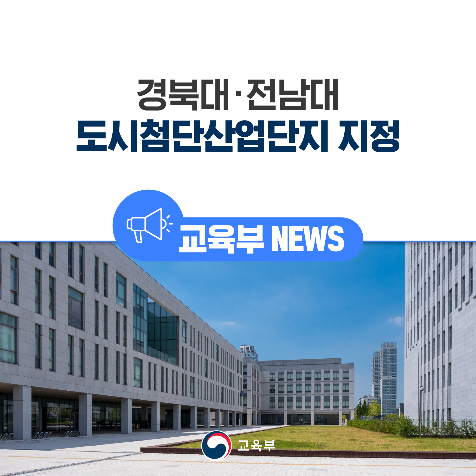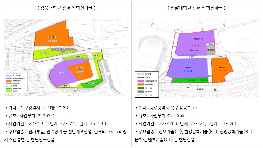 교육부(부총리 겸 교육부장관 이주호), 국토교통부(장관 원희룡), 중소벤처기업부(장관 이영)는 지난해 캠퍼스 혁신파크로 선정된 경북대학교와 전남대학교를 도시첨단산업단지로 지정한다고 12월 22일(목) 밝혔다.