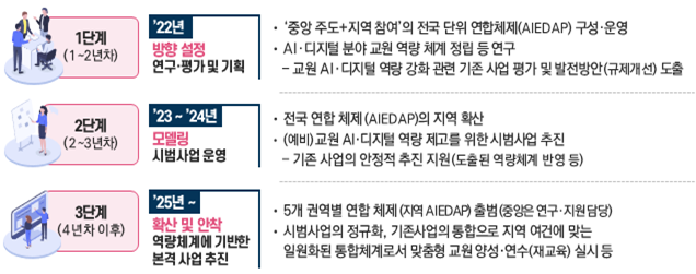 ‘AIEDAP(아이에답)’ 사업은 2022년 사업의 운영 성과 및 결과를 기반으로 2023년부터 권역별 시범사업* 운영을 거쳐, 2025년부터는 지역별 여건에 맞게 사업을 추진·확대할 계획이다.