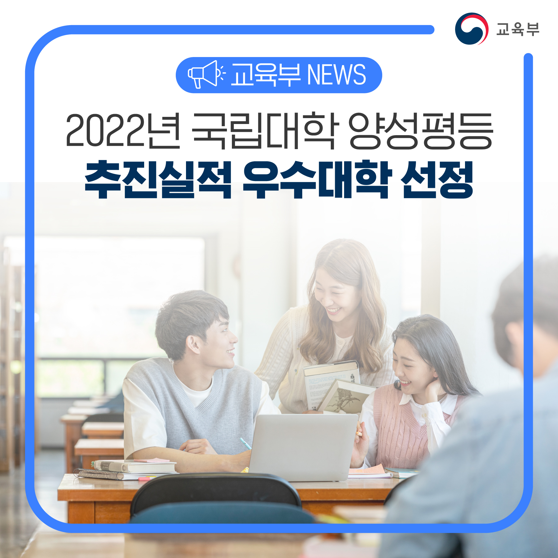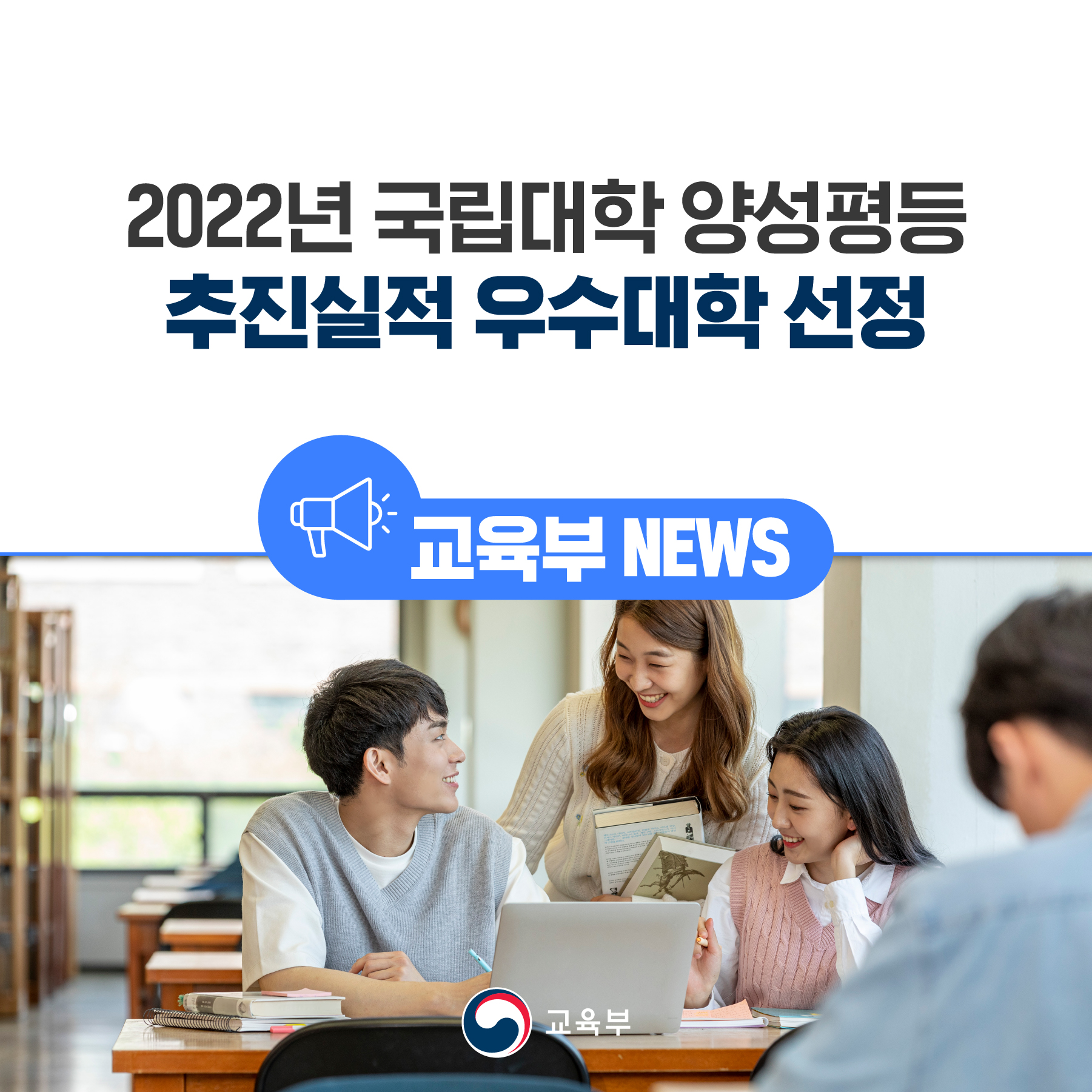 교육부(부총리 겸 교육부장관 이주호)는 국립대학 및 국립대학법인(39개교)의 2022년 양성평등 추진실적 우수사례와 평가 결과를 발표한다. 국립대학의 양성평등정책 추진을 장려하기 위해 교원임용 및 학내 의사결정 과정에서의 성별 다양성 확대 등 양성평등 실현 성과를 평가하고 지원해왔다.