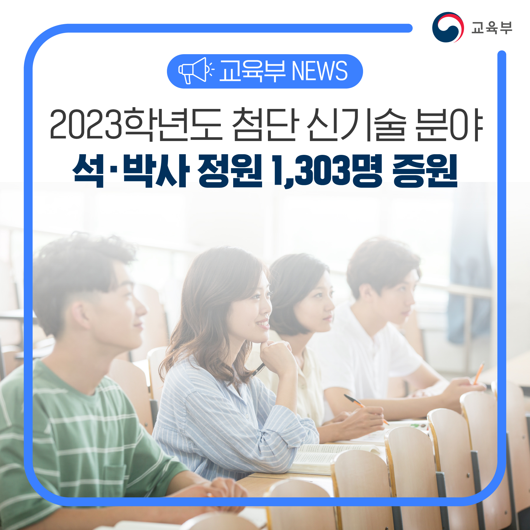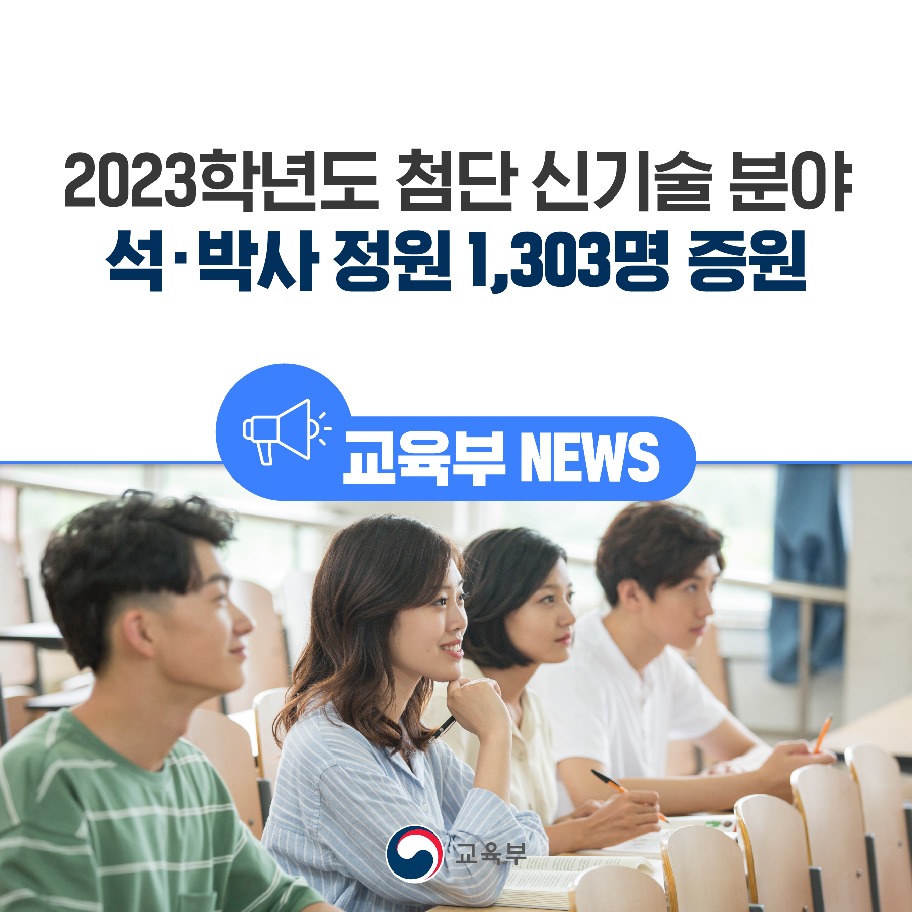 교육부(부총리 겸 교육부장관 이주호)는 기술혁신을 이끌 신기술 분야의 고급 인재양성 수요 증가에 대응하기 위해 2023학년도 반도체 등 첨단분야 석·박사 정원을 1,303명 증원한다.