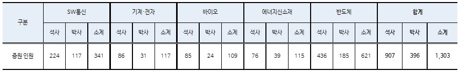 □ 소프트웨어․통신 341명, 기계․전자 117명, 생명(바이오) 109명, 에너지․신소재 115명, 반도체 621명 증원