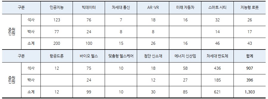 □ 신기술 분야에 대한 고급 인재양성 수요 증가와 첨단분야 기술혁신 지원을 위해 석·박사 정원 1,303명