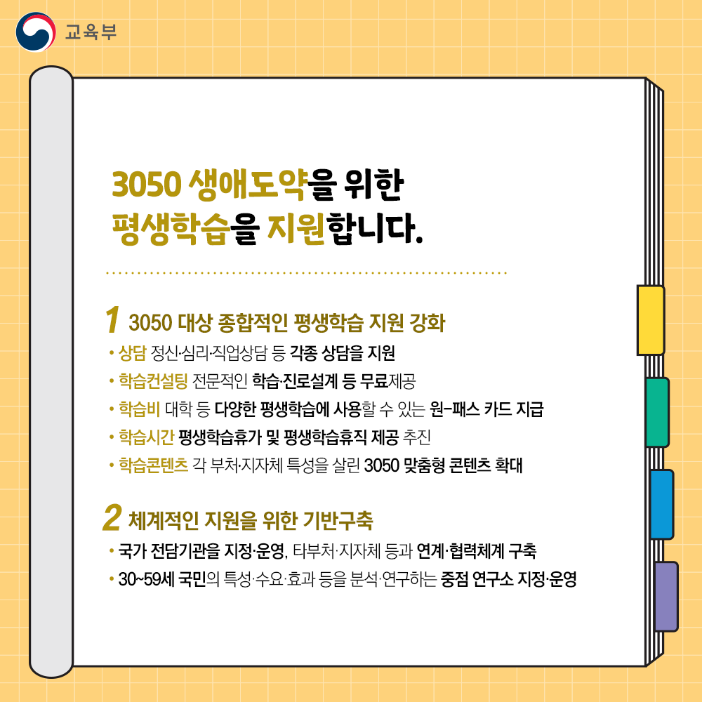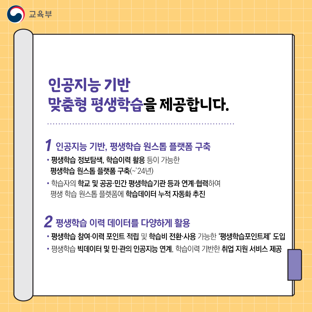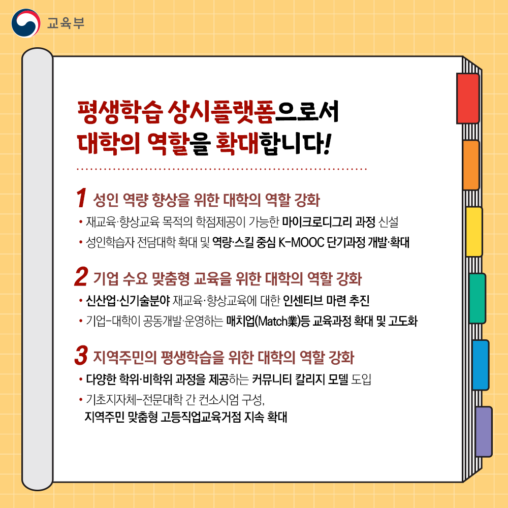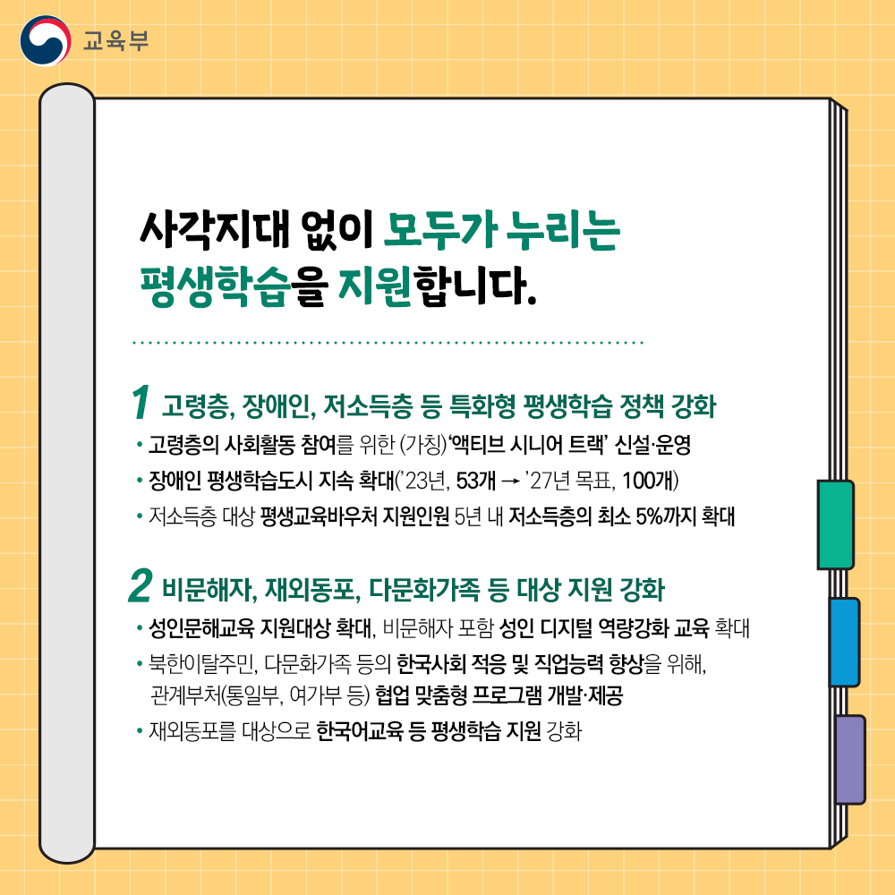#교육부 #평생학습 #대학역할확대 #평생학습상시플랫폼 #지역평생학습진흥 #규제혁신 #3050생애도약 #평생학습지원 #특화형평생학습정책강화 #학습경로유연화추진 #맞춤형평생학습 #인공지능기반