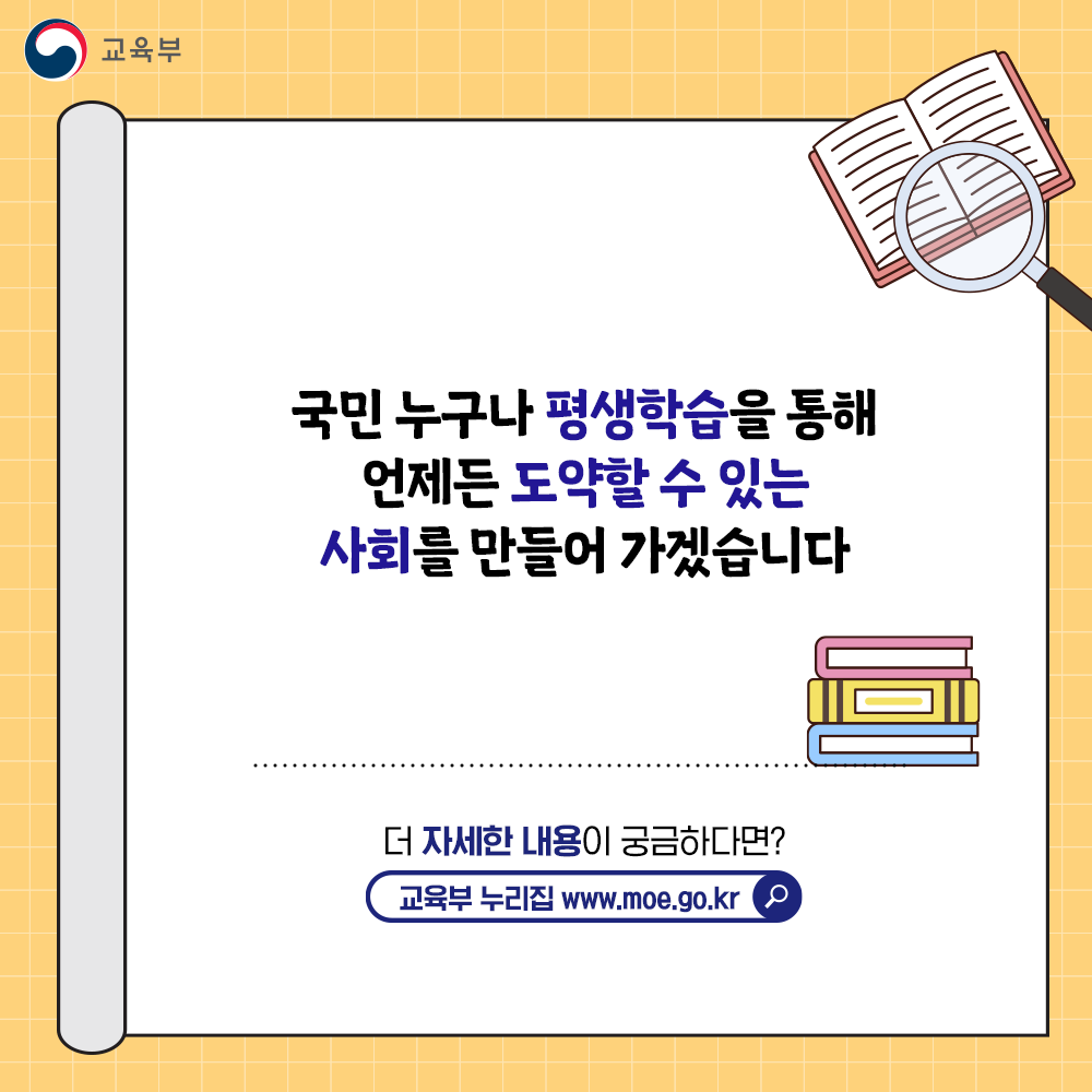 국민 누구나 평생학습을 통해 언제든 도약할 수 있는 사회를 만들어 가겠습니다!