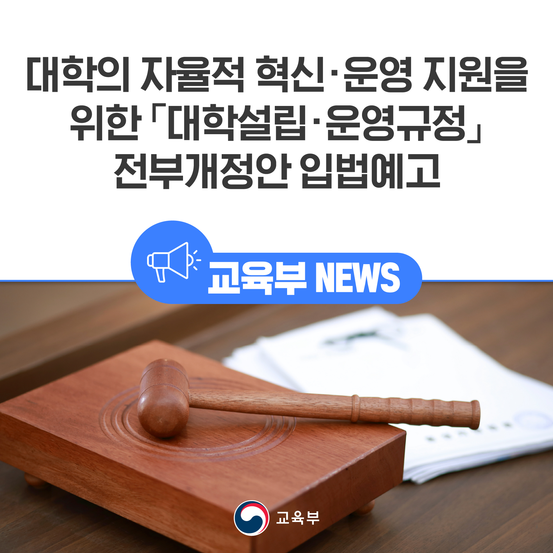 교육부(부총리 겸 교육부장관 이주호)는 대학의 자율적인 혁신·운영 지원을 위한 「대학설립·운영규정」 전부개정령안을 12월 30일(금)부터 내년 2월 13일(월)까지 40여 일간 입법 예고한다.