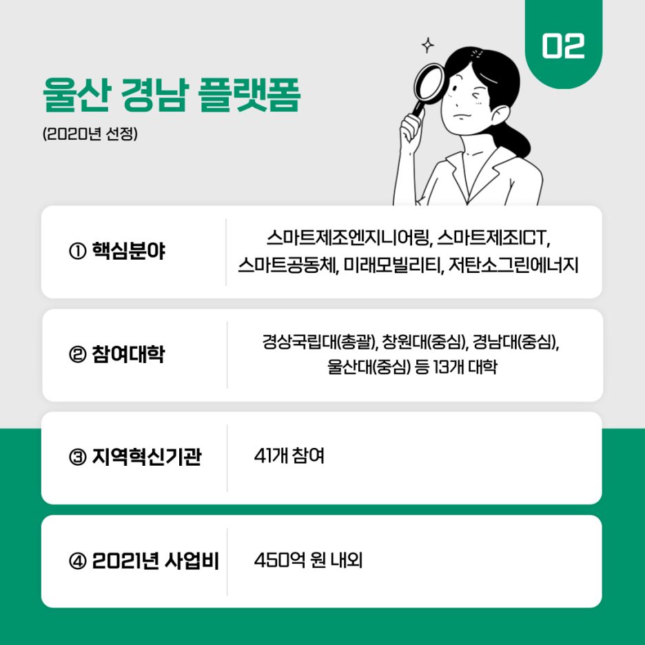지자체-대학 협력기반 지역혁신사업은 지자체와 대학이 협업체계(지역혁신플랫폼)를 구축하고, 지역에서 필요로 하는 인재를 양성하여 지역발전 생태계가 조성되도록 지원하는 사업입니다. 2020년부터 운영을 시작했는데 학생에게는 폭넓은 학업의 장을, 기업과 대학에는 인재 양성의 기회를, 지역에서는 발전의 발판을 만들 기회를 제공합니다. 2020년 신규 공모를 통해 경남(단일형), 충북(단일형), 광주·전남(복수형) 플랫폼을 선정했고 2021년에는 대전·세종·충남을 추가 선정하고 경남에 울산이 참여하여 울산·경남 복수형으로 전환했습니다.