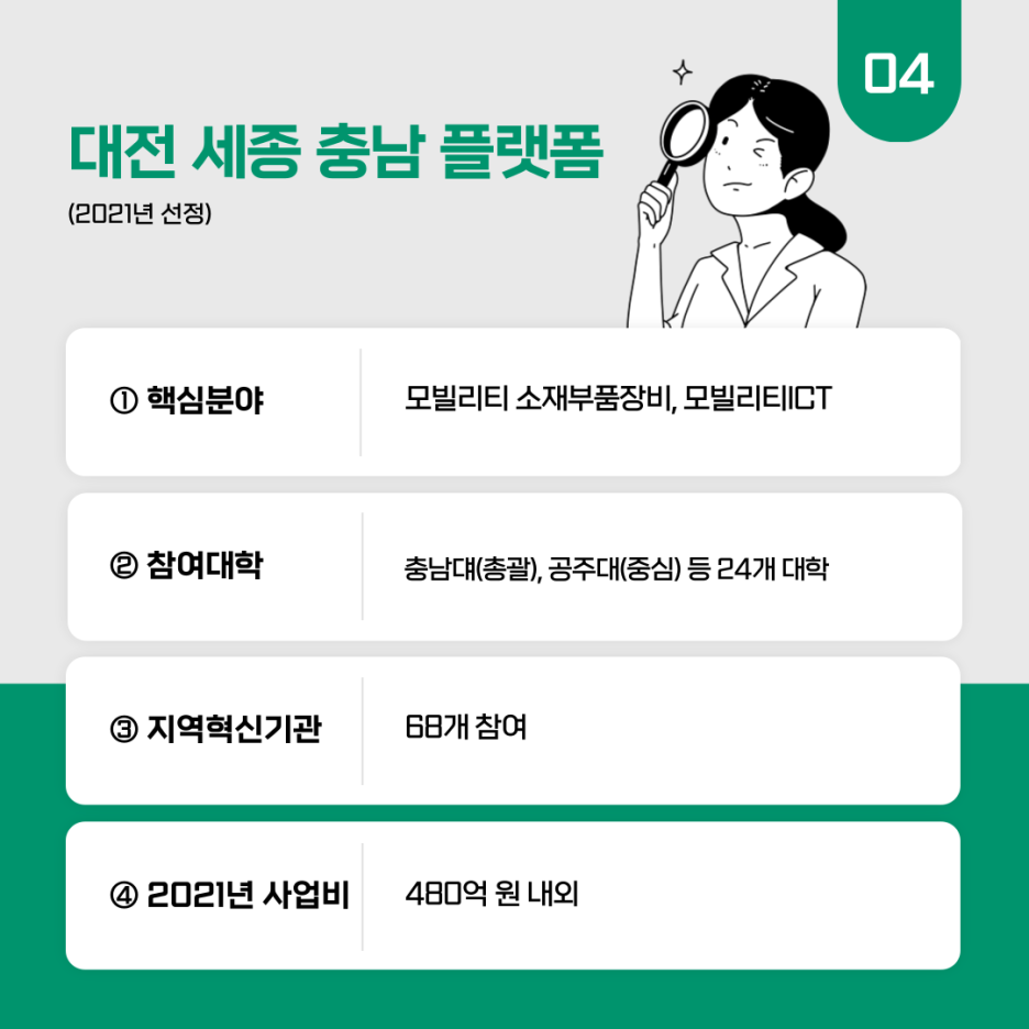 2021년에는 대전·세종·충남 플랫폼이 신규 선정되었는데요. 충남대(총괄), 공주대(중심) 등 24개 대학과 68개의 지역혁신기관이 참여했습니다. 모빌리티 소재부품장비, 모빌리티 ICT를 핵심분야로 운영하고 있습니다.