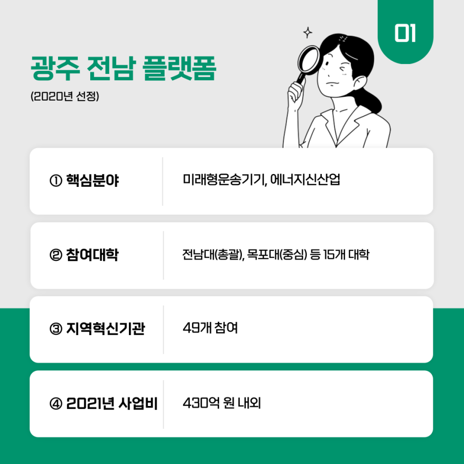 2020년 선정된 광주·전남 플랫폼은 전남대(총괄), 목포대(중심) 등 15개 대학과 49개의 지역혁신기관이 참여했습니다. 에너지신산업, 미래형 운송기기 등 2대 핵심분야에 관해 대학 간 6개의 융합 전공을 개설했습니다.