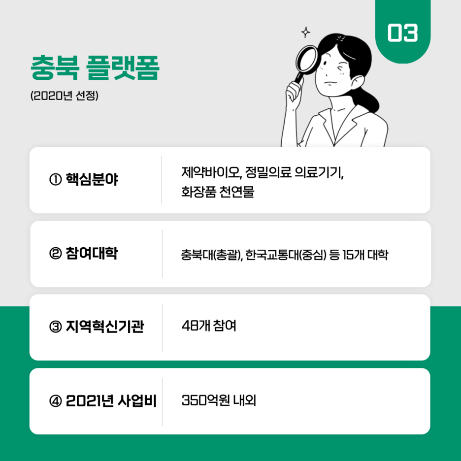 충북 플랫폼(2020년)은 충북대(총괄), 한국교통대(중심) 등 15개 대학과 48개의 지역혁신기관이 참여했는데요. 제약·바이오, 정밀의료·의료기기, 화장품·천연물을 핵심분야로 운영하고 있습니다.