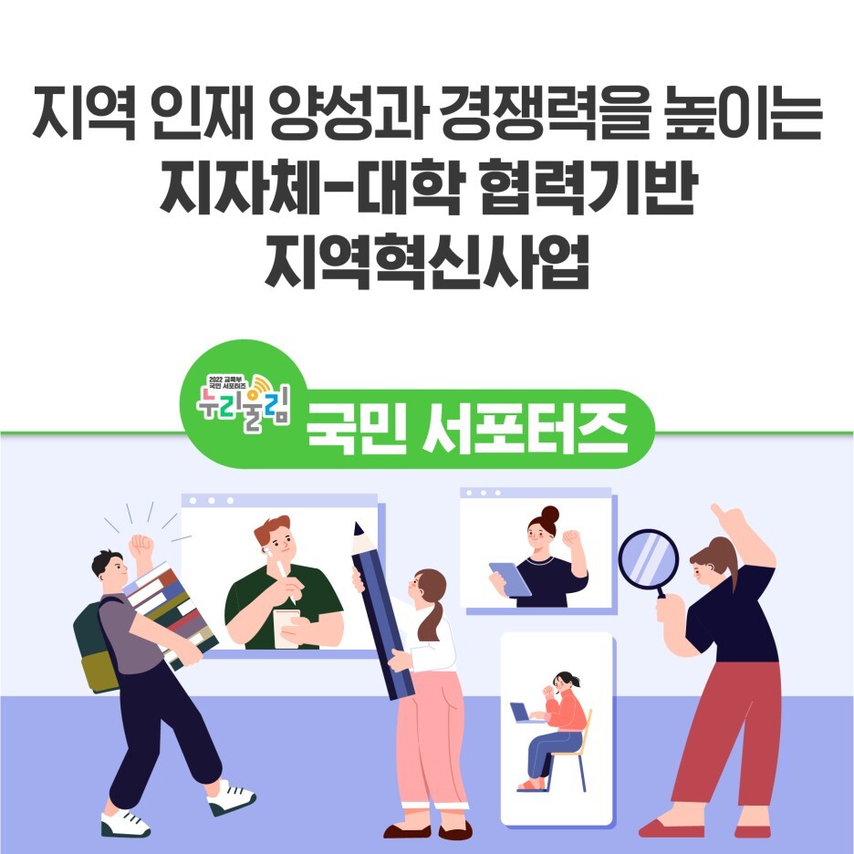 이렇게 지역인재의 성장과 역량을 위해 체계적으로 지원하는 ‘지자체-대학 협력 기반 지역혁신사업’에 대해 알아봤는데요! 지역대학을 지역혁신의 허브로 육성하는 사업이 성공해서 지방의 인재 유출을 막고 경쟁력 있는 지자체를 만들 수 있는 첫걸음이 되었으면 좋겠습니다.