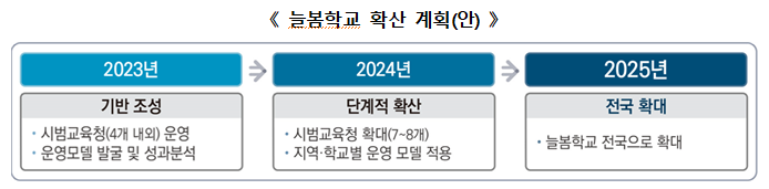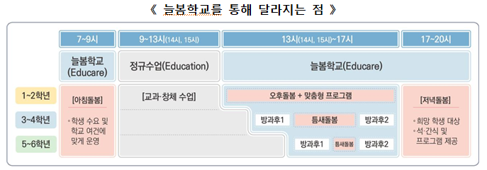 특히, 입학 초(3월 1~3주) 조기 하교로 인한 돌봄공백 해소를 위해 신입생 중 희망하는 학생들을 대상으로 방과 후 에듀케어 집중 지원 프로그램을 시범 운영한다. 고학년의 경우, 민간참여를 활성화하여 인공지능(AI)·코딩·빅데이터, 소규모·수준별 강좌 등 고품질 방과후 프로그램을 확대하고, 교육과 돌봄이 유기적으로 이루어질 수 있도록 틈새돌봄을 강화한다. 방과 후 운영체제를 교육청 중심의 지역단위로 개편하여 단위학교와 교원의 업무 부담을 경감할 수 있도록 지원하고, 2023년 시범운영을 통해 지역별․학교별 여건에 맞는 다양한 늘봄학교 모델을 개발하여 2025년에는 전국으로 확산할 계획이다.