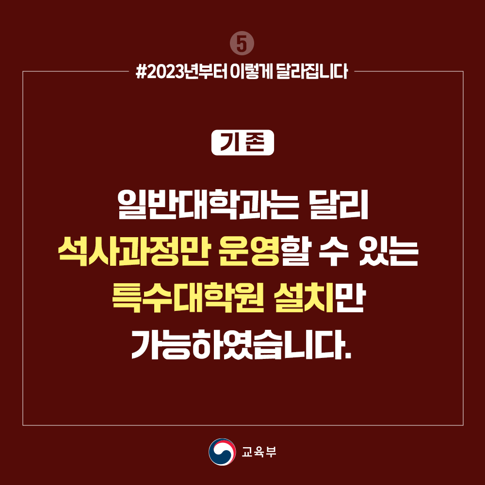 기존) 일반대학과는 달리 석사과정만 운영할 수 있는 특수대학원 설치만 가능하였습니다.