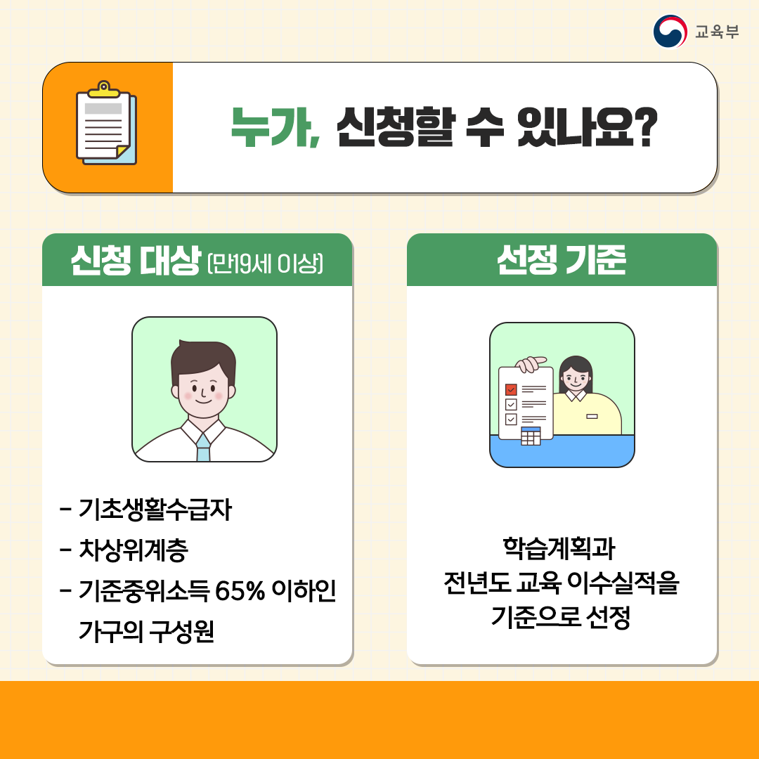- 신청대상(만19세 이상) : 기초생활수급자, 차상위계층, 기준중위소득 65% 이하인 가구의 구성원